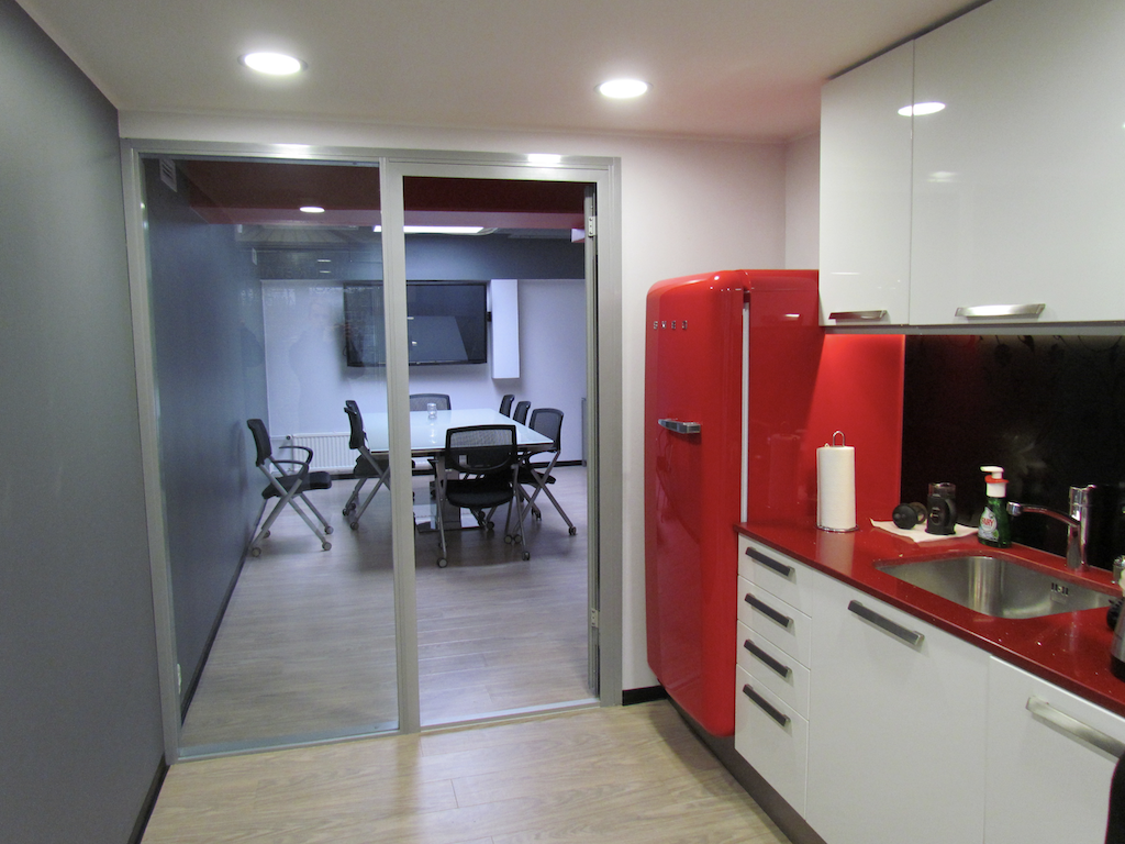 Valoisa avotoimistotila rakennuksen ylimmässä kerroksessa. Yhteiskäyttöiset keittiö- ja sosiaalitilat.