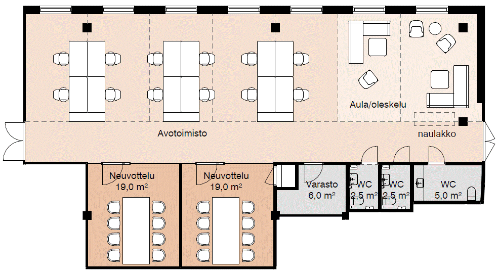 | Huoneluku | Avotila, 2 neuvotteluhuonetta, 3 wc:tä |