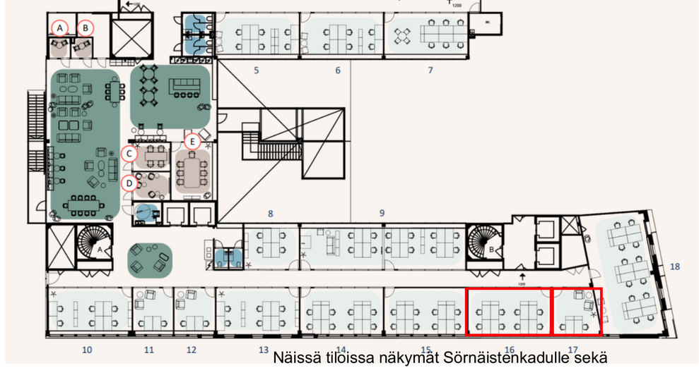 Vuokrattavana atriumintason toimisto (56 m2, 2 vierekkäistä huonetta 36 m2 ja 20 m2) uudistetusta toimistokiinteistöstä. Tilan ikkunat ovat Sörnäistenkadulle päin. Yhteiskäyttöiset keittiö-, lounge- ja sosiaalitilat. Kiinteistössä aulapalvelu, vuokrattavia neuvottelutiloja, lounasravintola, kuntosali. Hyvät julkiset kulkuyhteydet. Kalasataman metroasema kävelyetäisyydellä.