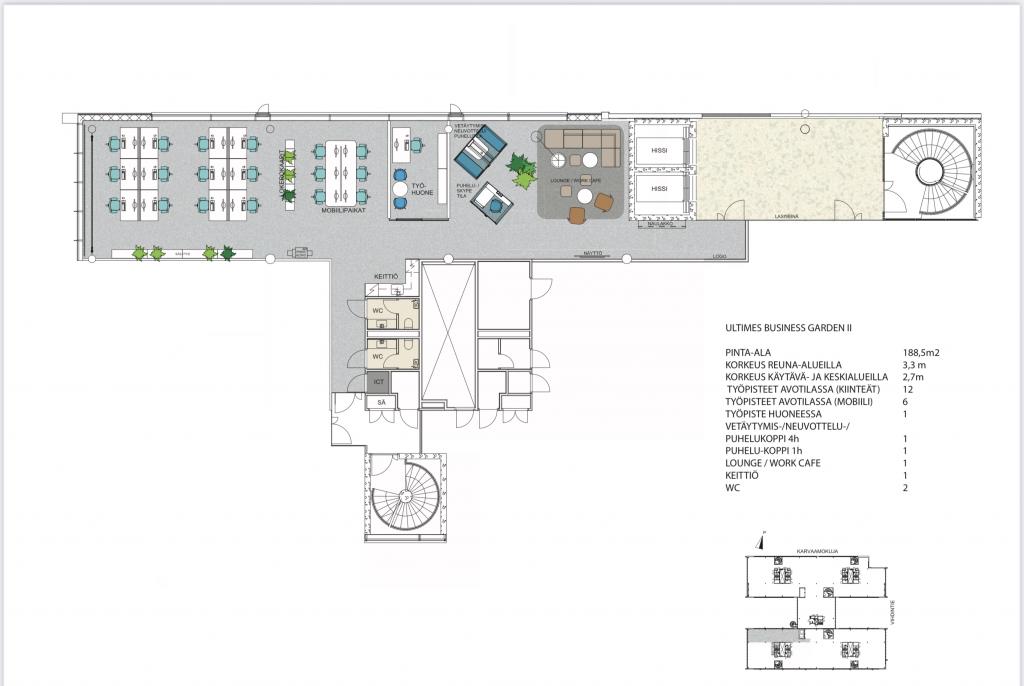 Ainutlaatuiseen Business Garden-konseptiin kuuluva tilojen helppo muunneltavuus mahdollistaa työtilojen järjestämisen kulloisenkin tarpeen mukaisesti olipa toiveena sitten monityötila tai perinteisempi tilaratkaisu.
