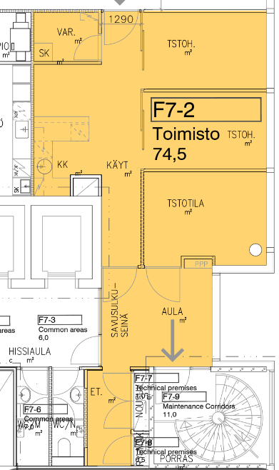 Vuokrattavana toimisto (75 m2). Tila sijaitsee Ison Omenan 7. kerroksesta. Toimistossa on oma keittiö; yhteiskäyytöiset wc-tilat sijaitsee ihan vieressä.