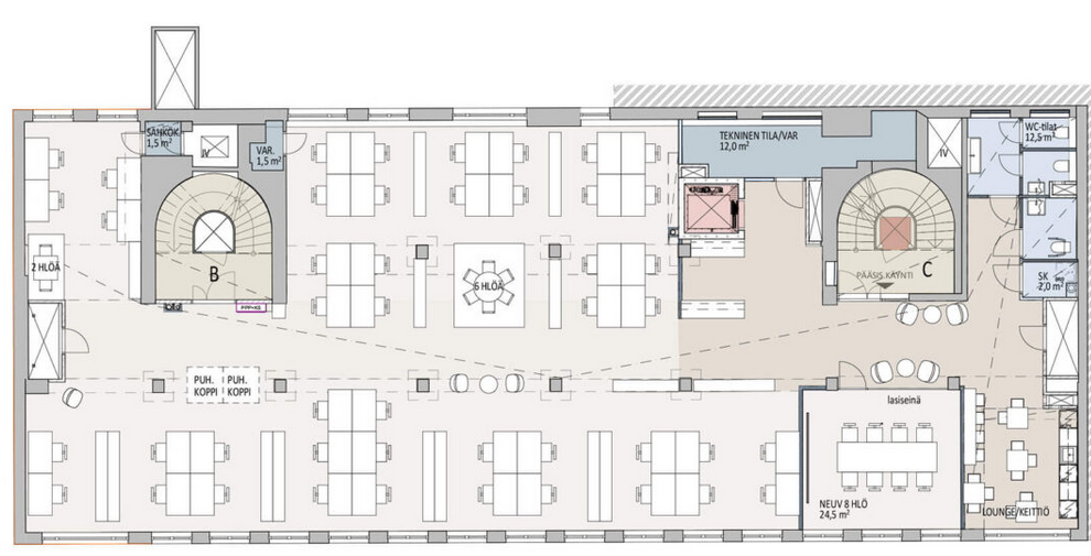 Vuokrattavana moderni 5.kerroksen toimisto (417 m2) täydellisesti uudistetusta toimistotalosta, joka rakennettiin vuonna 1939 Varman pääkonttoriksi. Vaalea funktionalismin helmi tarjoa vuokralaisille ja heidän vieraille erinomaiset puitteet. Suojaise sisäpiha ravintolan terasseineen kutsuu viihtymään myös toimistopäivän jälkeen. Näkymät tilasta viihtyisälle sisäpihalle.