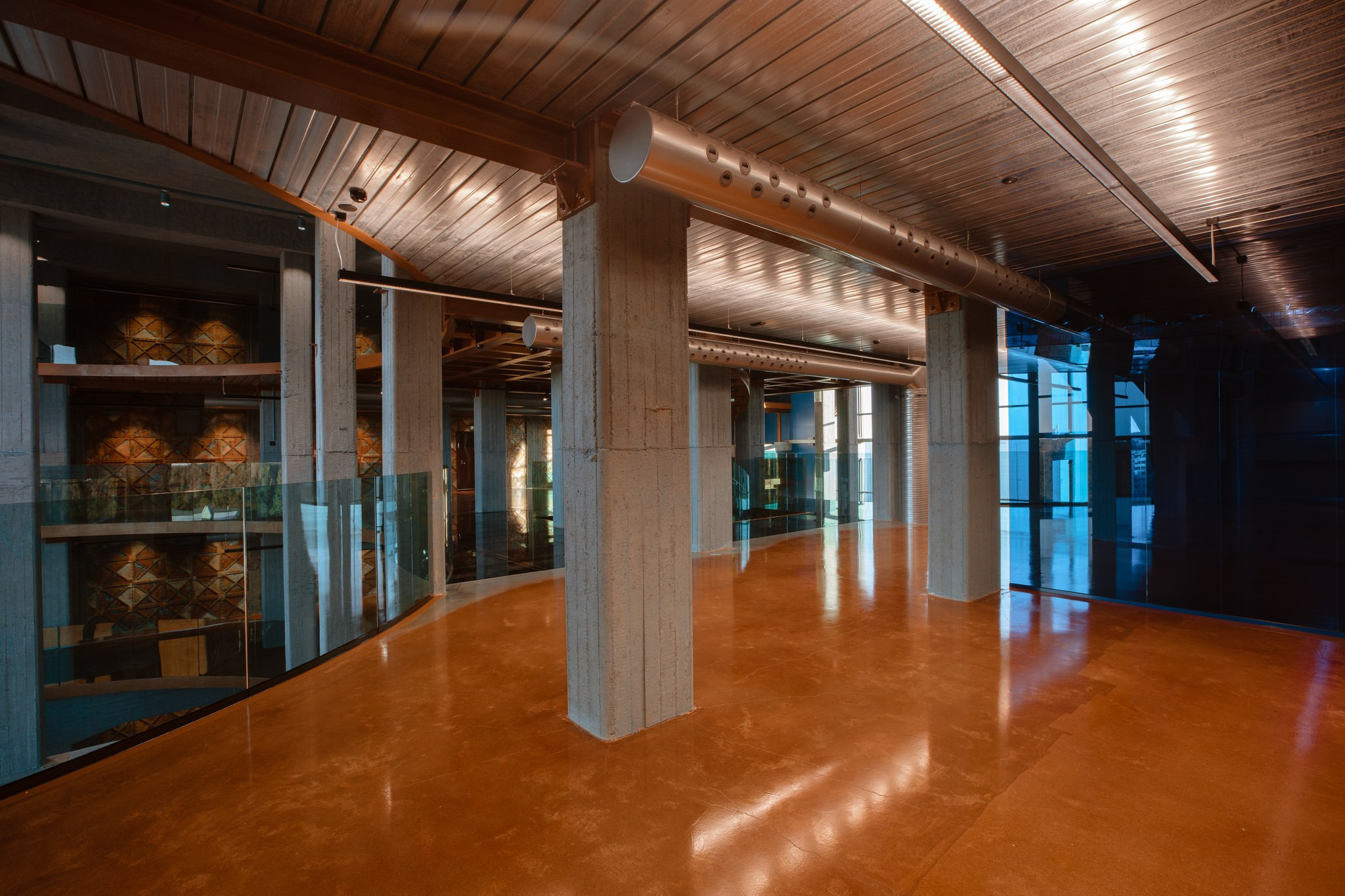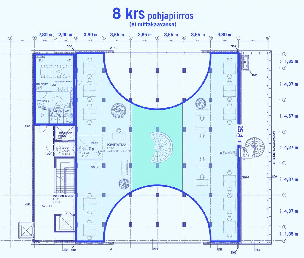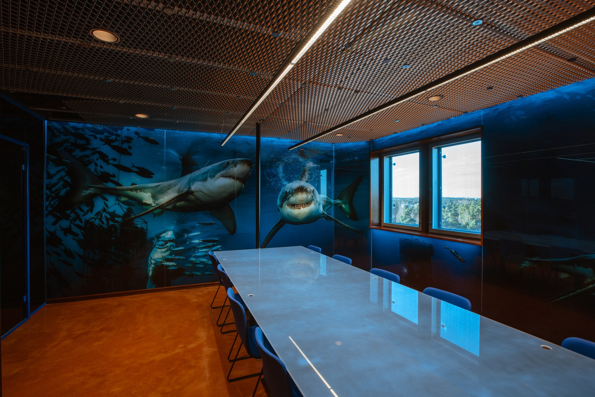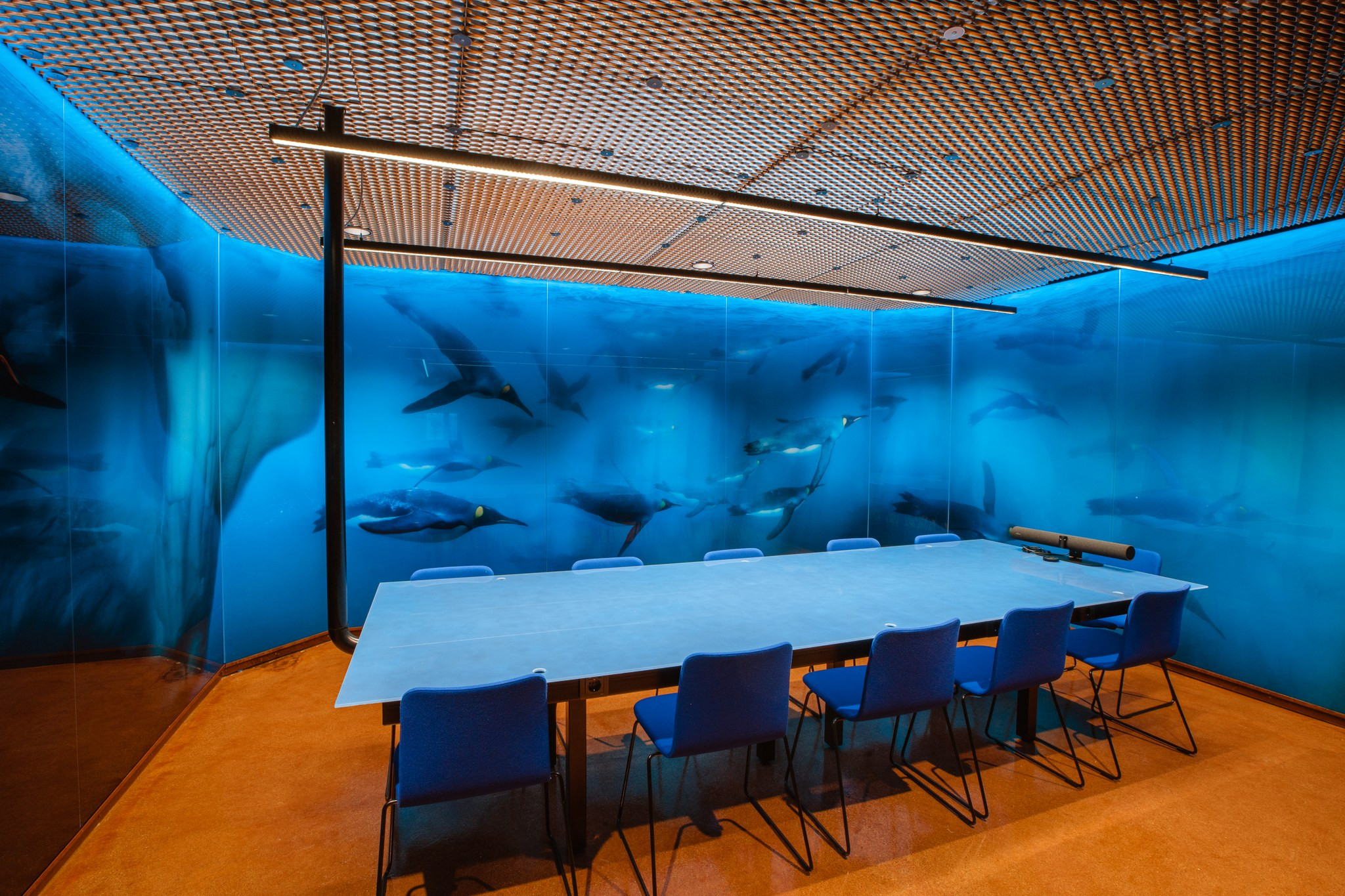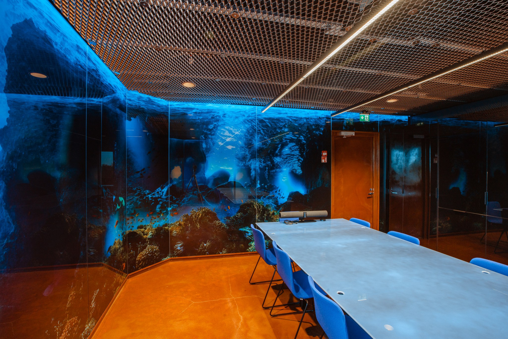 12,5 metriset pyöreät ikkunat luovat akvaariomaisen näkymän “vedenalaiseen” yrityskeskukseen. Kerroksissa on erilliset 10 hengen neuvottelutilat.