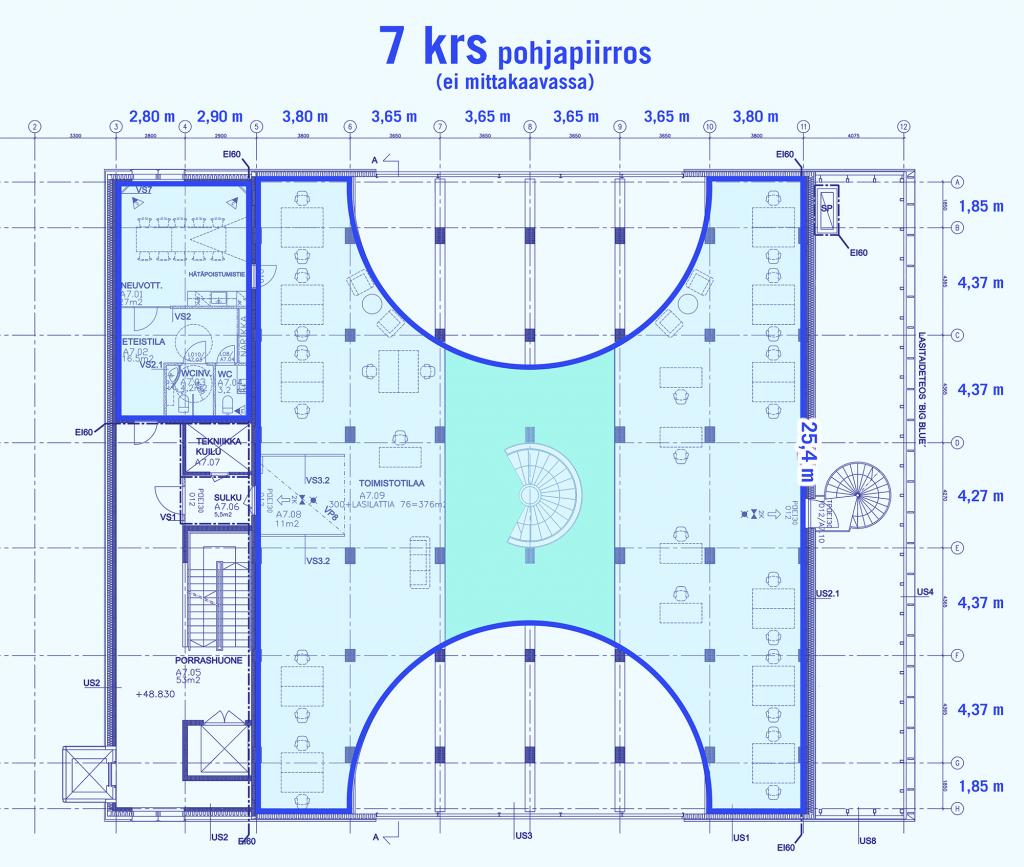 Tilakokonaisuus, jossa kahdessa kerroksessa a 376m2 avotoimistot sekä 27m2 neuvottelutilat, lisäksi wc-/ inva wc-tilat.