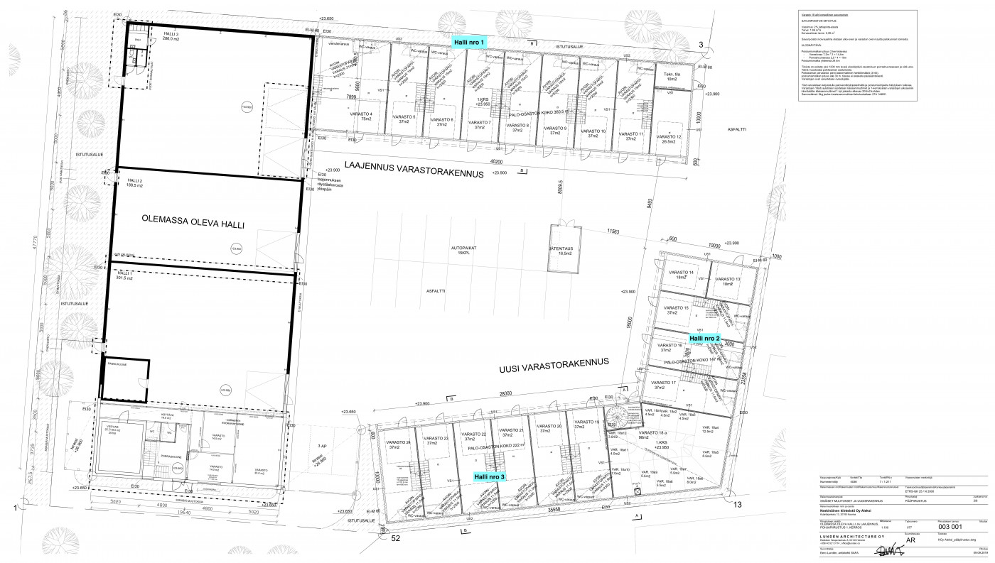 Nosto-oven mitat: korkeus 3,5m x leveys 3,0m. Hallin nosto-ovien edessä öljyn-hiekanerotuksella varustetut lattiakaivot. Lämmitysmuoto ilmalämpöpumput. Lattiapinta 37m2 + 12m2 parvi.