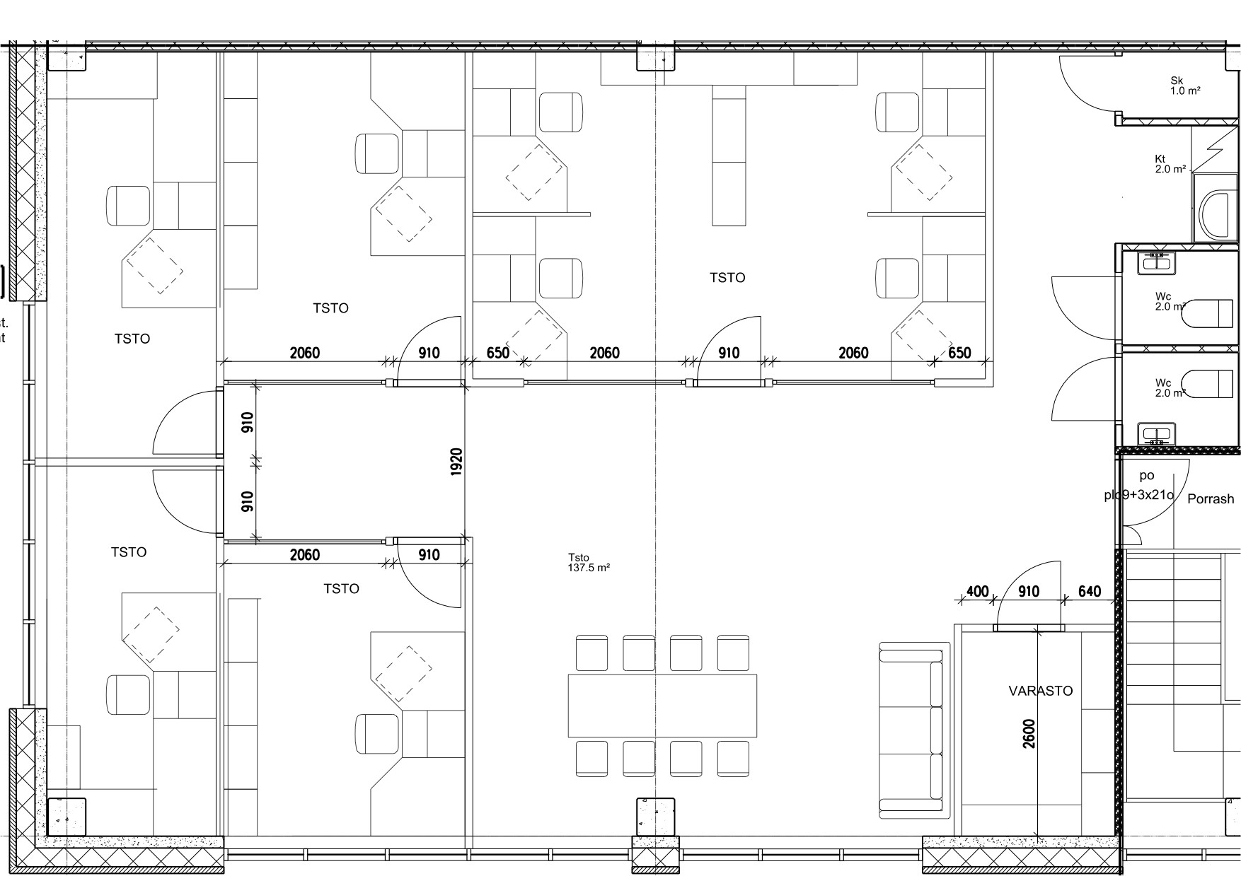 Tilakokonaisuus, jossa todella siistit 2.krs jäähdytettävät 144,5m2 toimistotilat, jossa avotilan lisäksi viisi toimistohuonetta sekä neuvottelutilat ja pieni keittiönurkkaus ja varastohuone.