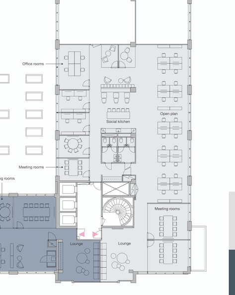 Toisen kerroksen tyylikäs ja valoisa toimistotila, josta näkymä suoraan Triplaan. Tilat sisältävät avotilaa, tiimi- ja neuvotteluhuoneita ja pienempiä työhuoneita. Tilaa on mahdollista muunnella vuokralaisen tarpeiden mukaan ja jakaa pienemmiksi tiloiksi.