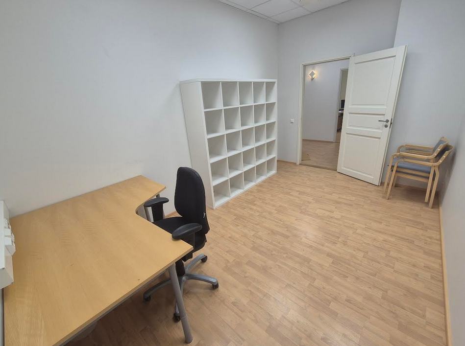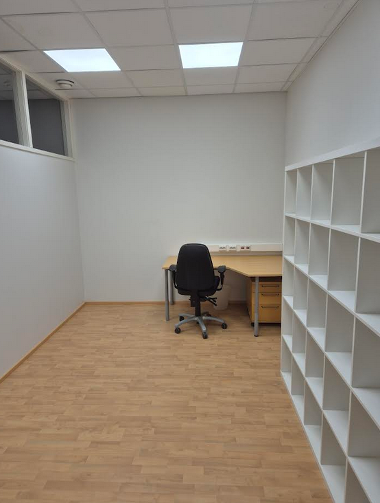 Vuokrattavana toimistohuone ( n 12 m2; yhteiskäyttöiset keittiö- ja sosiaalitilat). Tilaan tulee luonnonvaloa kattoikkunoista.