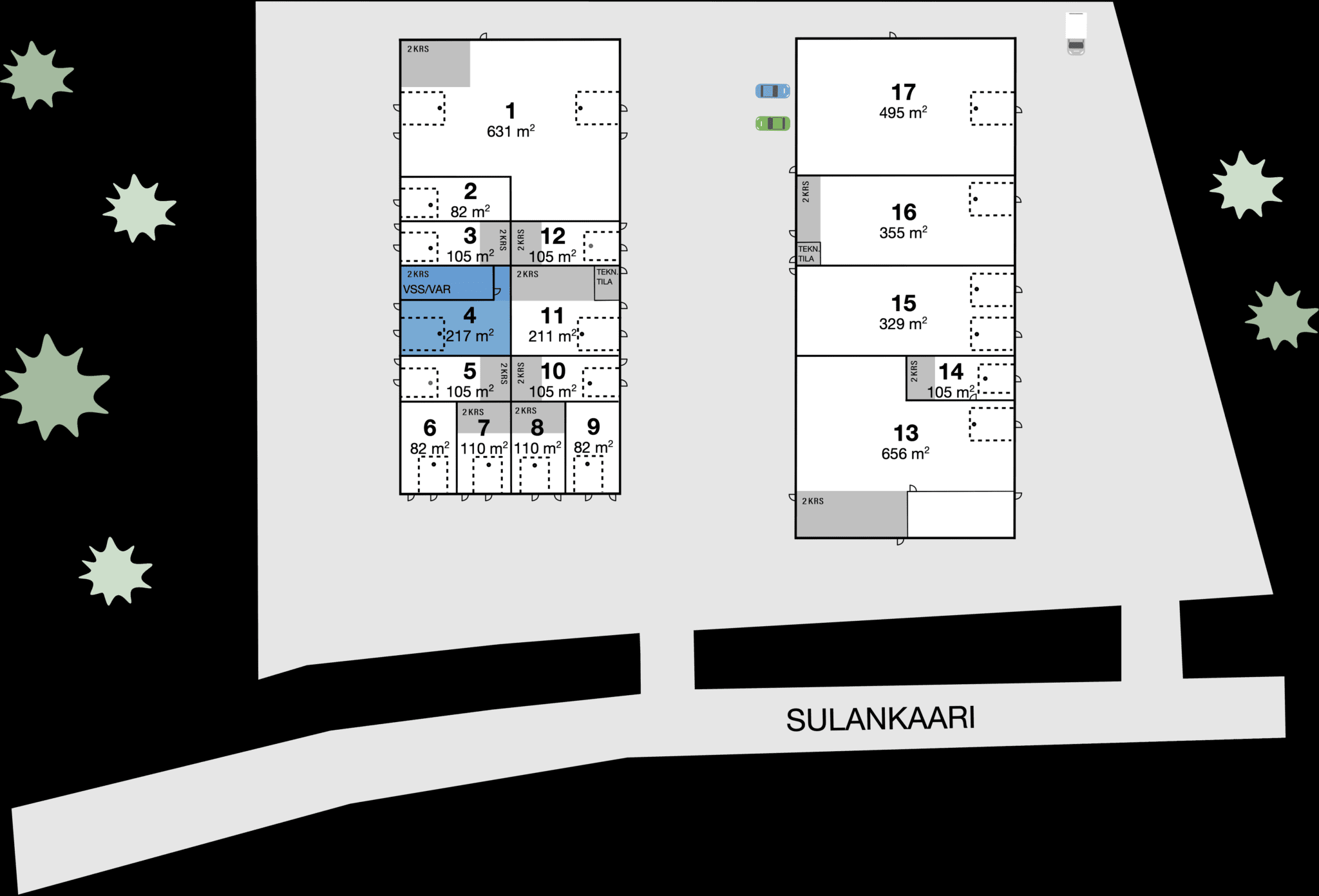 Kohteessa on maalämpö, A-energialuokka, öljyn erotuskaivo, aurinkopaneelit, sähkökäyttöiset nosto-ovet, aita ja kauko-ohjattava liukuportti.