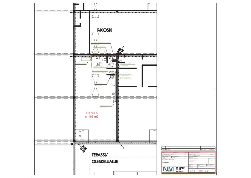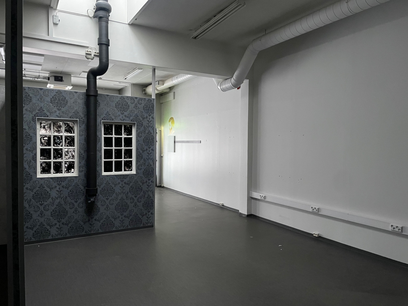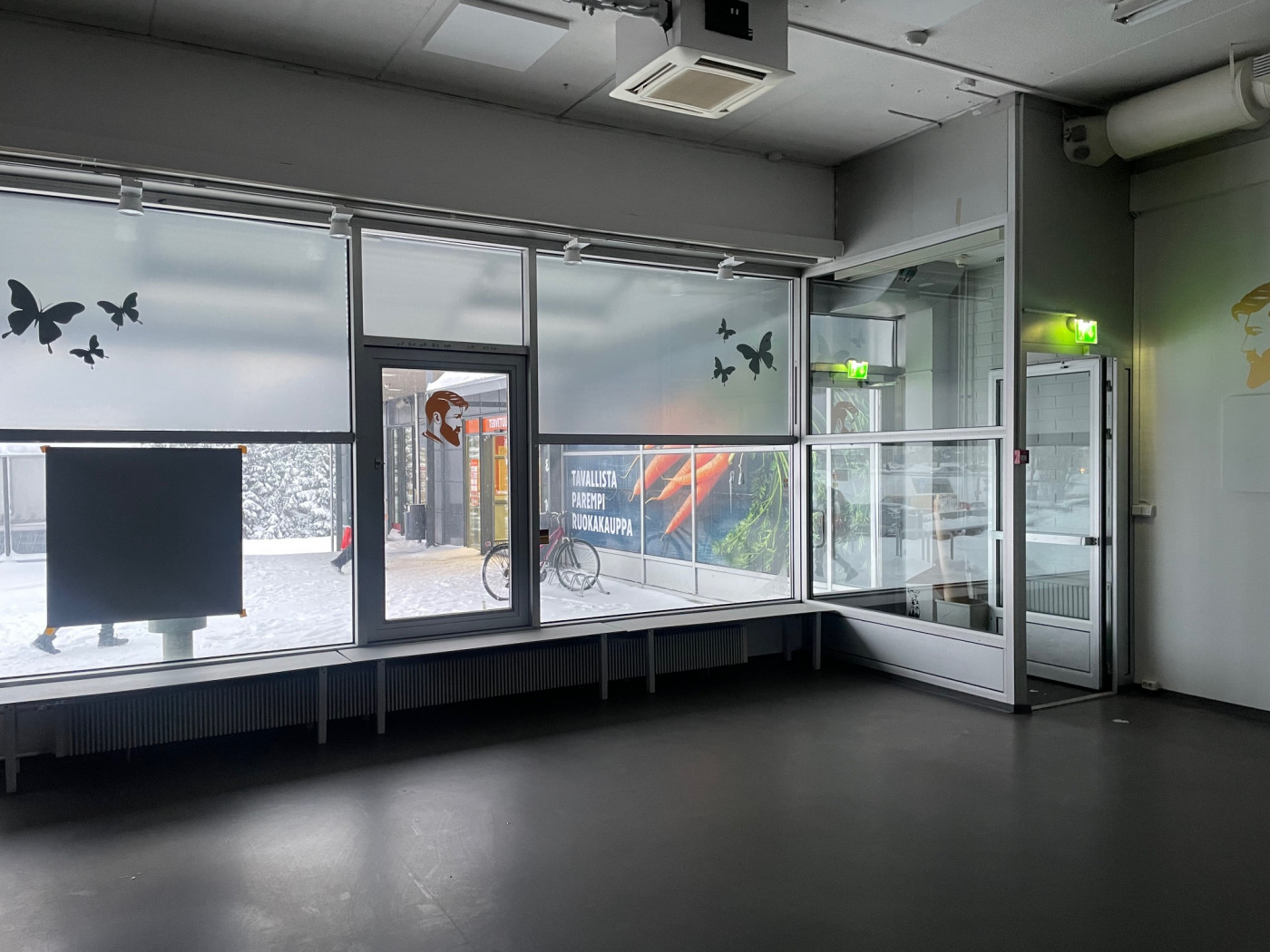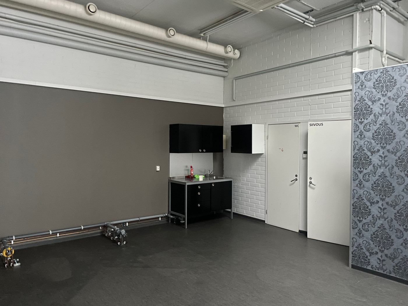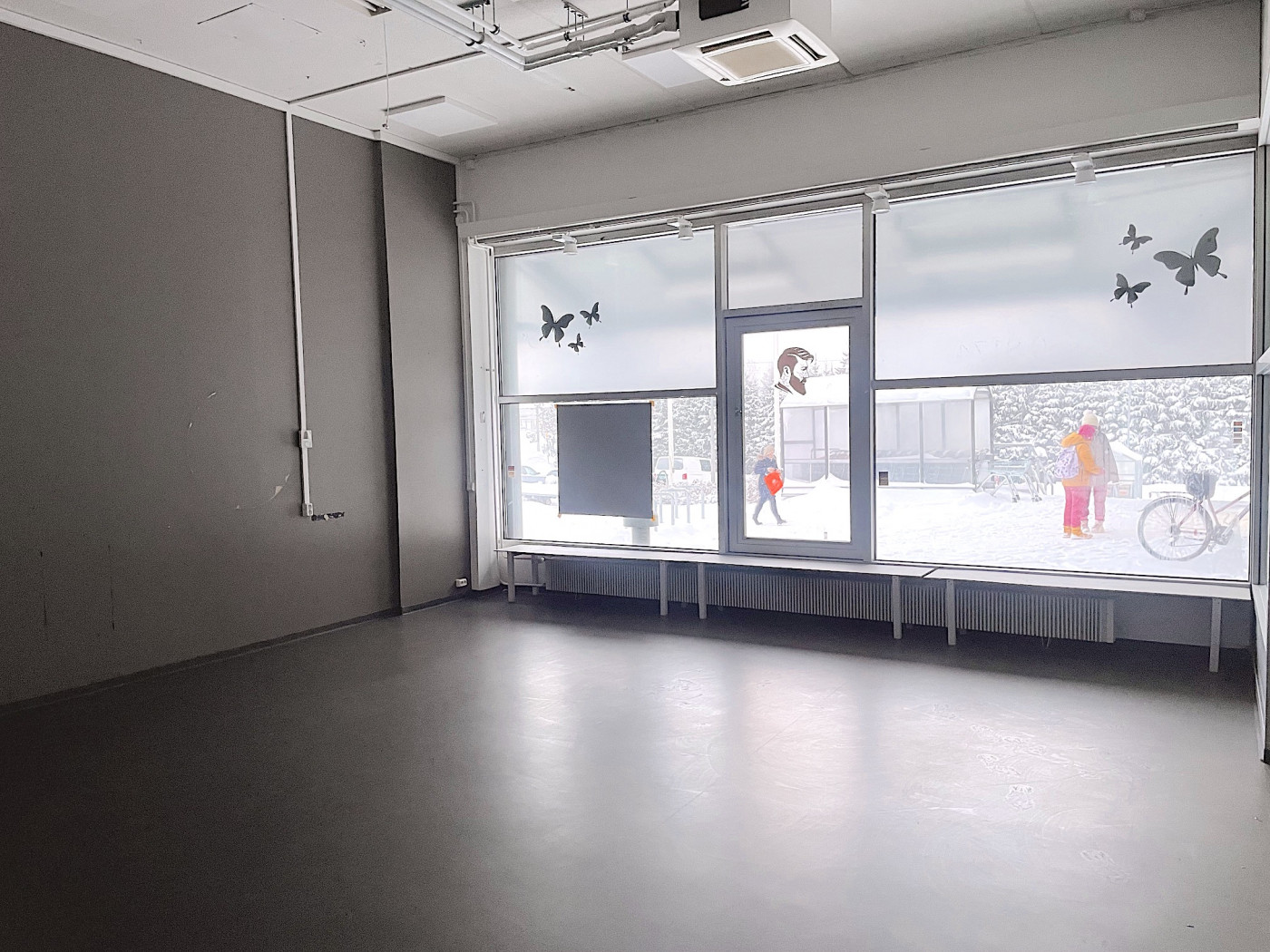 Tilassa toiminut aiemmin parturi, mm. hiusten pesupaikkojen tarvittava putkitus valmiina. Avotila, joka on kevyellä väliseinällä eroteltu kahteen tilaan. Tilassa on jäähdytys.