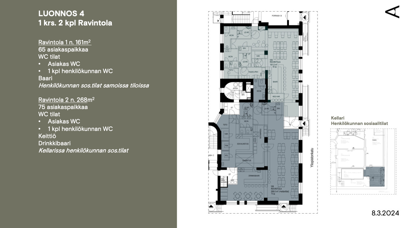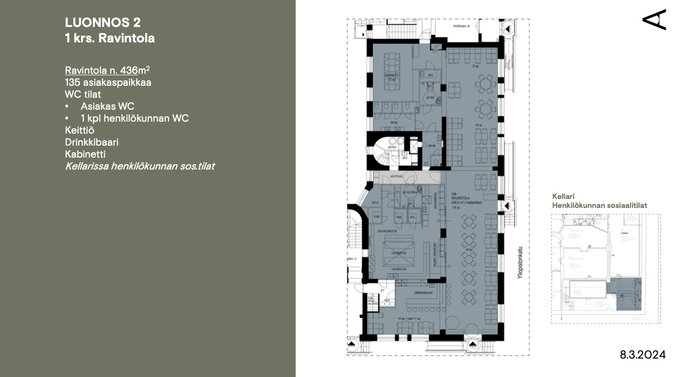 Vuokrattavana huippupaikalta ravintolatilat Turun ydinkeskustassa aivan Kauppatorin vierestä, osoitteessa Yliopistonkatu 15, Turku. Tilasuunnitelmia on ARCO Architecture Company Oy:n toimesta tehty neljä kappaletta. Tilakoot vaihtelevat 161m2 aina 436m2 asti. Tässä vaiheessa pääse vielä vaikuttamaan tilojen lopulliseen layoutiin. Luonnos 1:sen mukainen 330m2 ja 88 paikkainen ravintola, jossa iso drinkkibaari ja keittiö. Luonnos 2:sen mukainen 436m2 ja 135 paikkainen ravintola, jossa iso drinkkibaari ja kabinetti sekä keittiö Luonnos 3:sen mukainen 268m2 ja 73 paikkainen ravintola, jossa iso drinkkibaari ja keittiö. Luonnos 4:sen mukainen 161 m2 ja 65 paikkainen baarityylinen ravintola sekä 268m2 ja 75 paikkainen ravintola, jossa drinkkibaari ja keittiö. Maamiesten Kauppatalon kiinteistö saneerataan kauttaaltaan ja tilat päivitetään tekniikaltaan ja materiaaleiltaan vastaamaan tämän päivän odotuksia huippuluokan toimitiloista. Saneeraus valmistuu syksyllä 2024, ja tässä vaiheessa voi vielä vaikuttaa tilan layoutiin ja pintamateriaaleihin. Tiloja rakennettaessa otetaan huomioon esteettömyysvaatimukset. Kiinteistössä on sisäpihalla mahdollisuus pyöräparkille, joka tukee suosittua työmatkapyöräilyä. Tilojen luovutus alk. 1.9.2024 Vuokralaisten on mahdollista vuokrata autopaikkoja kiinteistön pysäköintipaikoilta tai sitten pysäköintihallista. Lisäksi Toriparkista on myös halutessaan mahdollista vuokrata tarvittava määrä autopaikkoja. Lisää toimitiloja www.rhg.fi