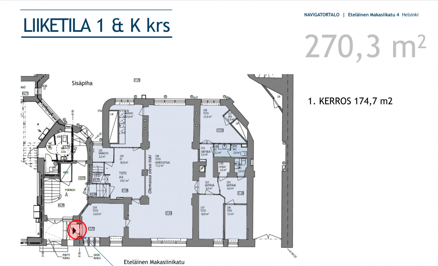 Vuokrataan n. 270m2 liike- tai toimistotilaksi soveltuva tila arvokiinteistössä. Maantasokerroksessa noin 175 m² näyttävää toimitilaa omalla sisäänkäynnillä Eteläiselle makasiinikadulle. Tilassa suuri huonekorkeus ja ikkunat sekä upeita yksitiskohtia. Maantasokerroksesta johtaa sisäportaat alempaan kerrokseen jossa noin 96 m² wc- ja aputiloja. Alemmasta kerroksesta vielä oma ovi yhtiön kellarikerrokseen. Tila soveltuu erityisen hyvin yritykselle, jolla myymälätilaa maantasokerroksessa ja tätä tukevat wc- ja varastotilat kellarissa. Yhtä hyvin tila soveluu mainiosti esimerkiksi kiinteistövälitysliikkeelle tai muuksi toimistotilaksi, joka hyötyy omasta sisäänkäynnistä kadulta näyttävään maantasokerroksen tilaan. Tila vapautuu tammikuussa 2025 tai erikseen sovittaessa aiemmin. Kiinteistössä ja sen välittömässä läheisyydessä lukuisia ravintoloita ja muita palveluita. Rakennuksessa saunatila. Kysy lisää Jouko Raitanen Helsinki puh. 0504695444