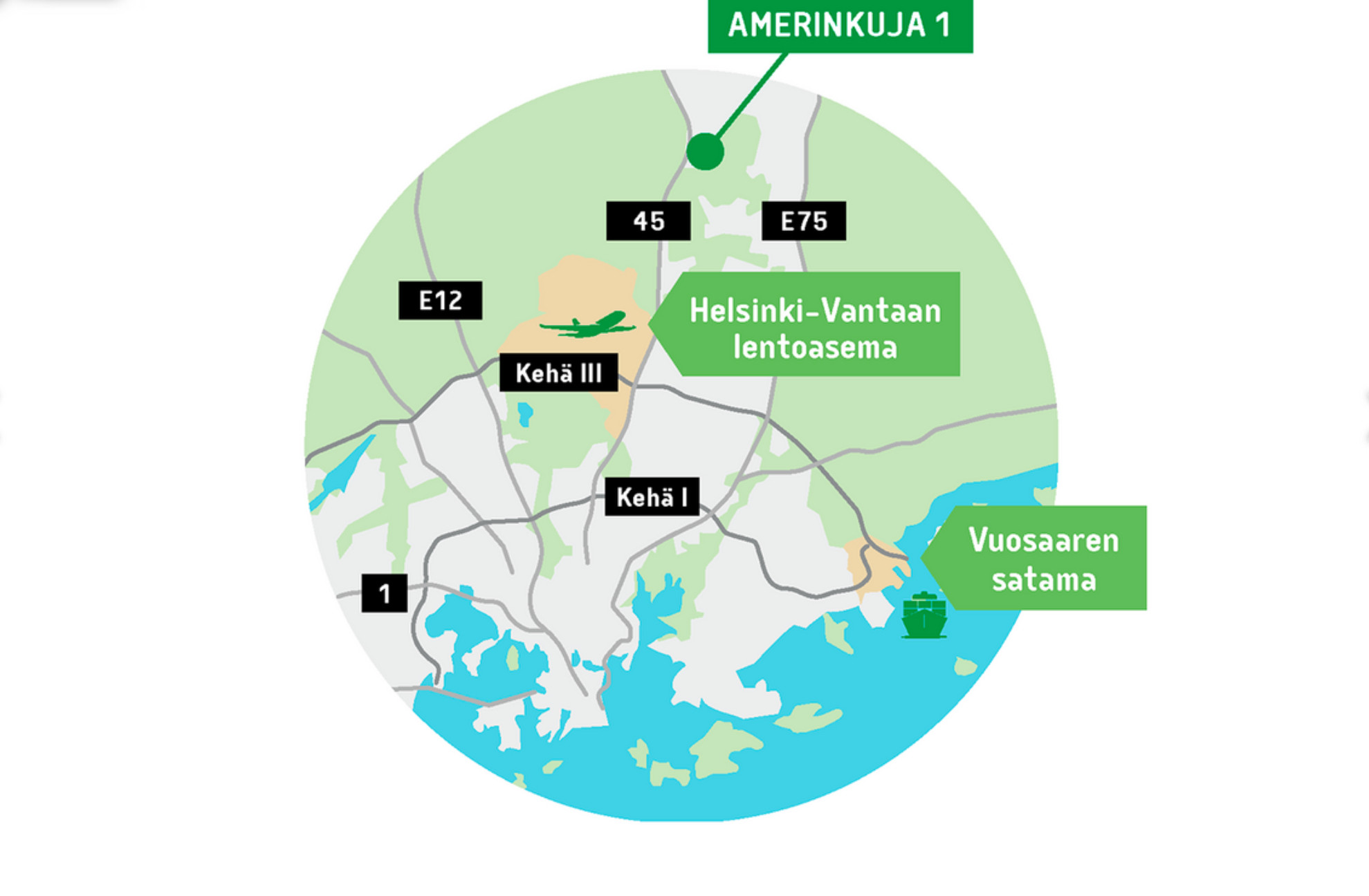 Amerinkuja kohoaa logistisesti erinomaiselle sijainnille, Tuusulanväylän välittömään läheisyyteen. Ajoaika Kehä III:lle on normaaliolosuhteissa n. 10 min. Matkaa Helsinki-Vantaan lentoasemalle kertyy n. 11 km ja Vuosaaren satamaan n. 25 km. Vierestä kulkevan Tuusulan Itäväylän kautta on myös suora yhteys Lahden moottoritielle Keravan liittymästä.