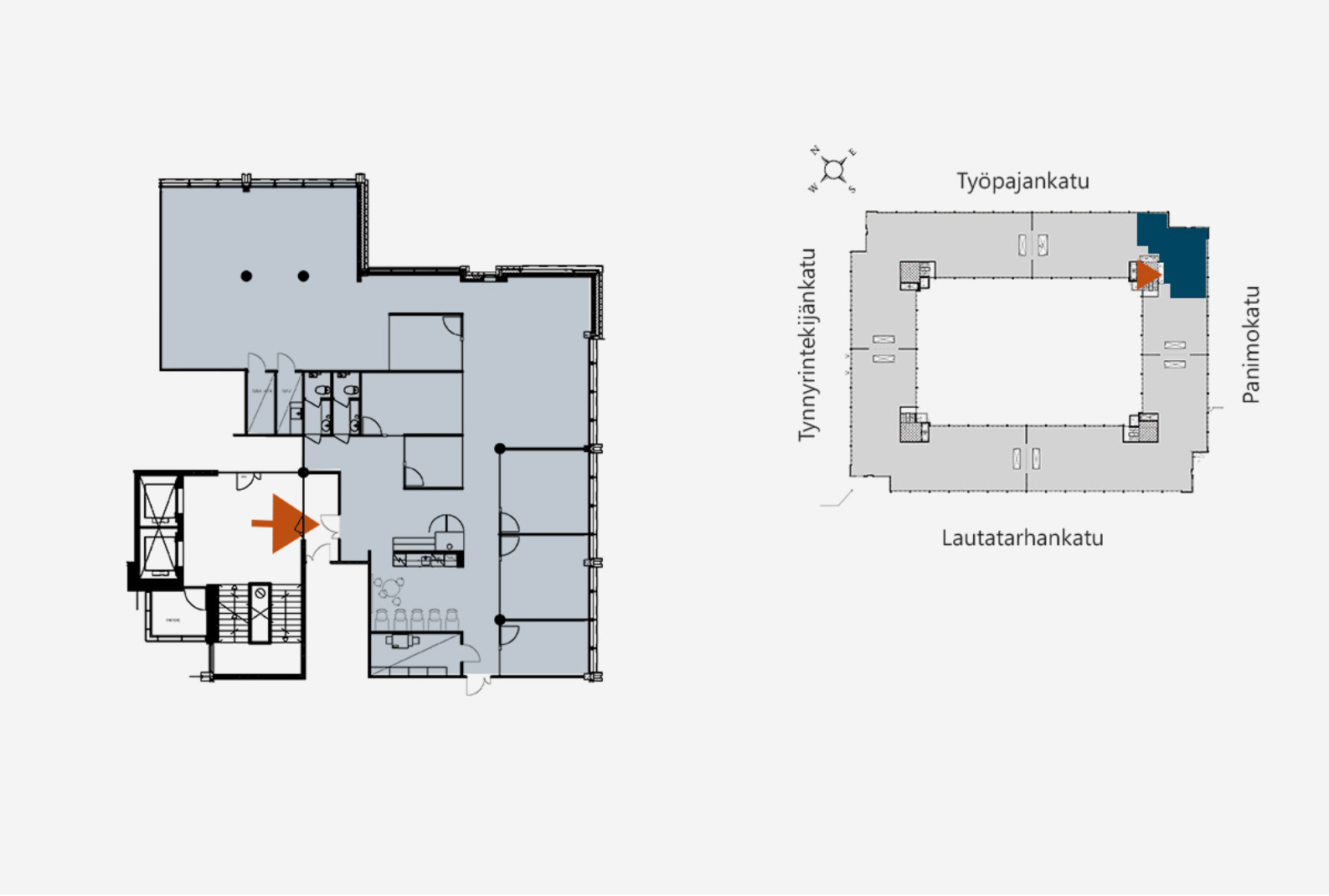 Toimiston keskiössä sijaitsevat neuvotteluhuoneet, yksi 6-8 hengelle ja kaksi 2-4 hengelle. Keittiö + loungetila sijaitsevat omassa kulmassaan. Lisäksi toimistossa on varasto, johon voi sijoittaa esim. monitoimilaitteen ja siivouskomero.