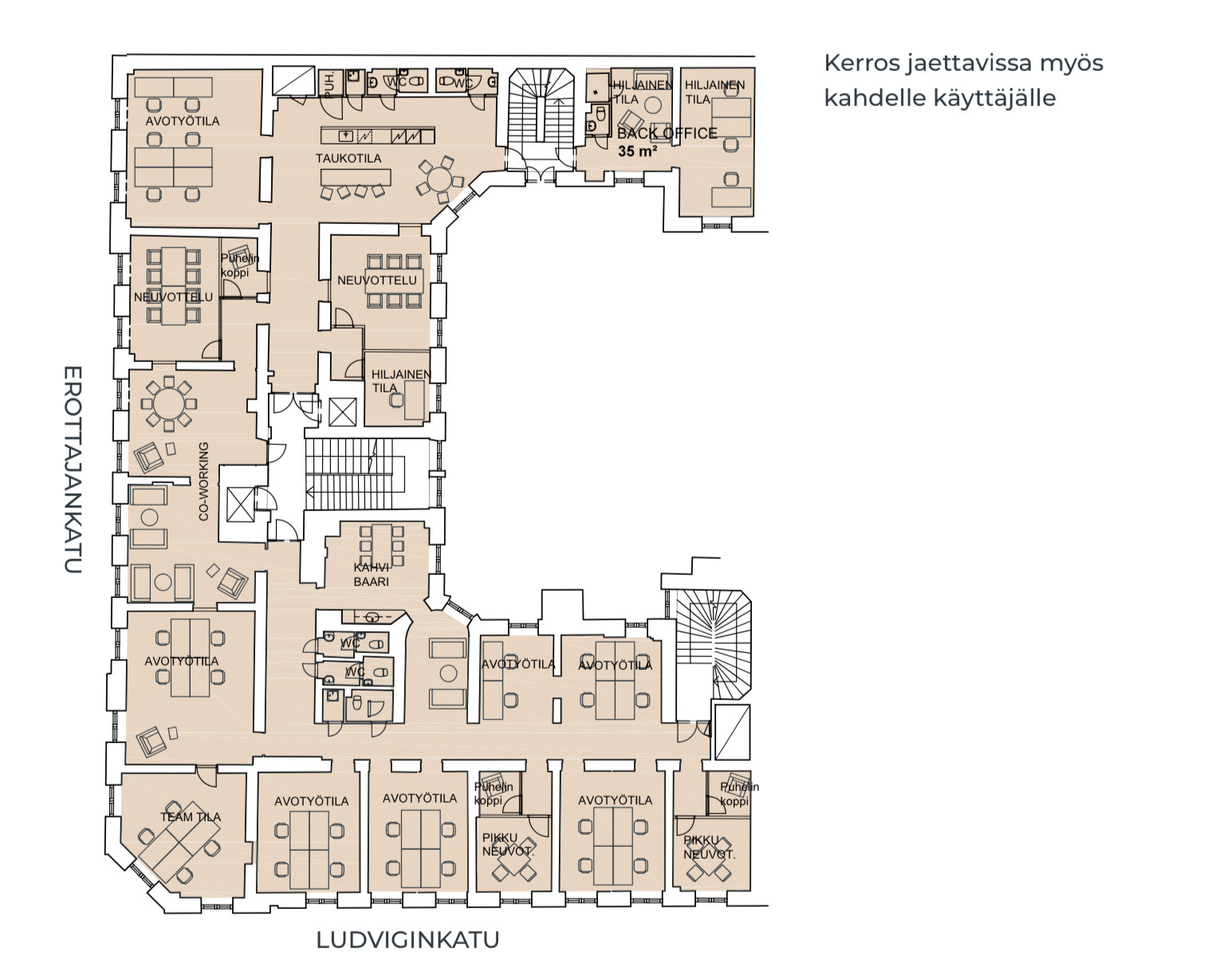Vuokrataan 4. kerroksen 505m2 toimistotila huippupaikalla. Tämä upea toimitila tarjoaa yrityksellesi koko kerroksen käyttöön Helsingin arvostetulla Erottajankadulla. Tila sijaitsee historiallisessa ja hyvin hoidetussa kiinteistössä, yhdistäen arvokkaan vanhan ajan tunnelman ja modernit toimistoratkaisut. Avarat ja valoisat tilat mahdollistavat monipuoliset käyttötarkoitukset ja muunneltavissa olevat pohjaratkaisut, jotka voidaan räätälöidä juuri yrityksesi tarpeisiin. Kerros voidaan jakaa kahdelle käyttäjälle.