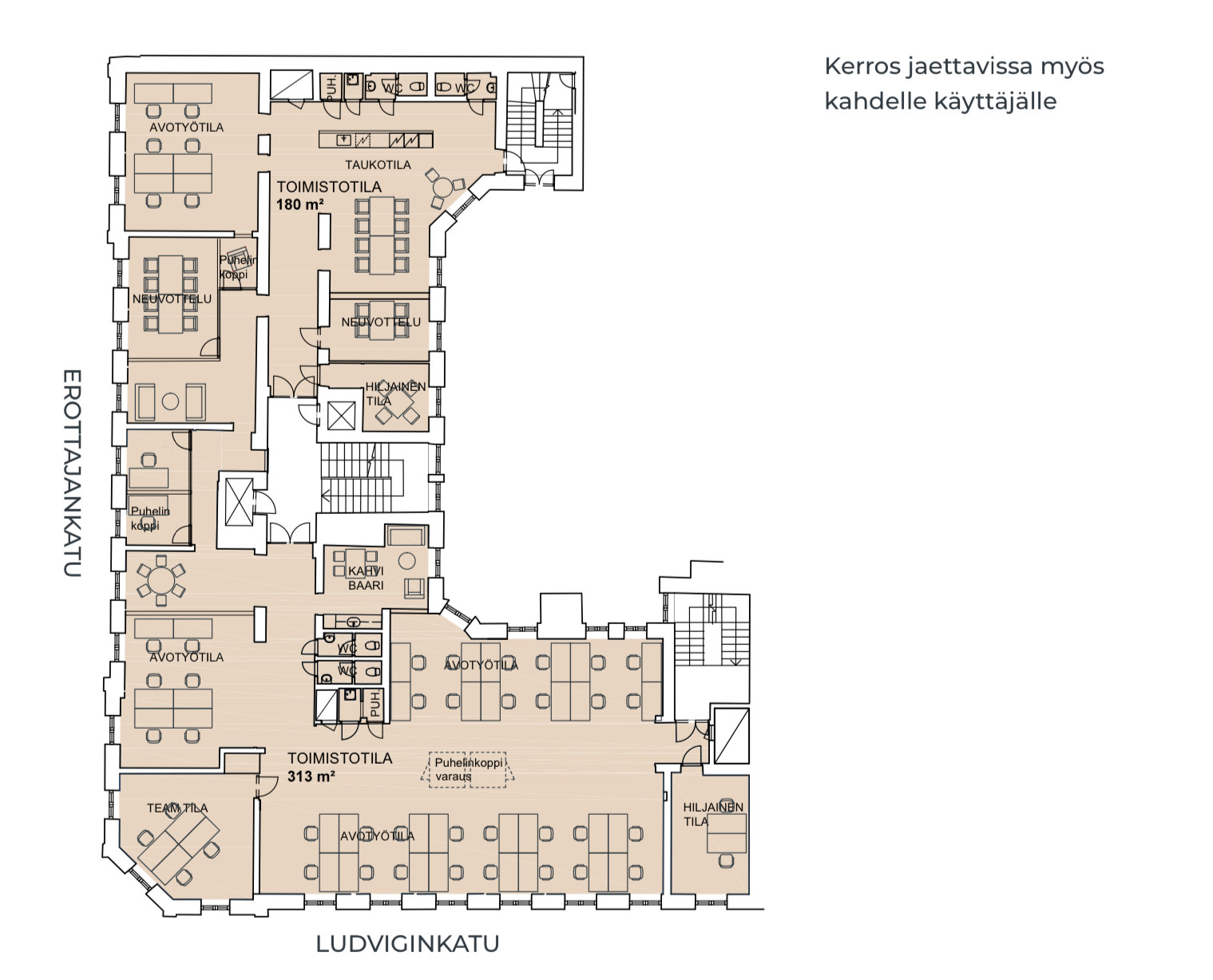 Vuokrataan 6. kerroksen 493m2 toimistotila huippupaikalla. Tämä upea toimitila tarjoaa yrityksellesi koko kerroksen käyttöön Helsingin arvostetulla Erottajankadulla. Tila sijaitsee historiallisessa ja hyvin hoidetussa kiinteistössä, yhdistäen arvokkaan vanhan ajan tunnelman ja modernit toimistoratkaisut. Avarat ja valoisat tilat mahdollistavat monipuoliset käyttötarkoitukset ja muunneltavissa olevat pohjaratkaisut, jotka voidaan räätälöidä juuri yrityksesi tarpeisiin. Kerros voidaan jakaa kahdelle käyttäjälle.