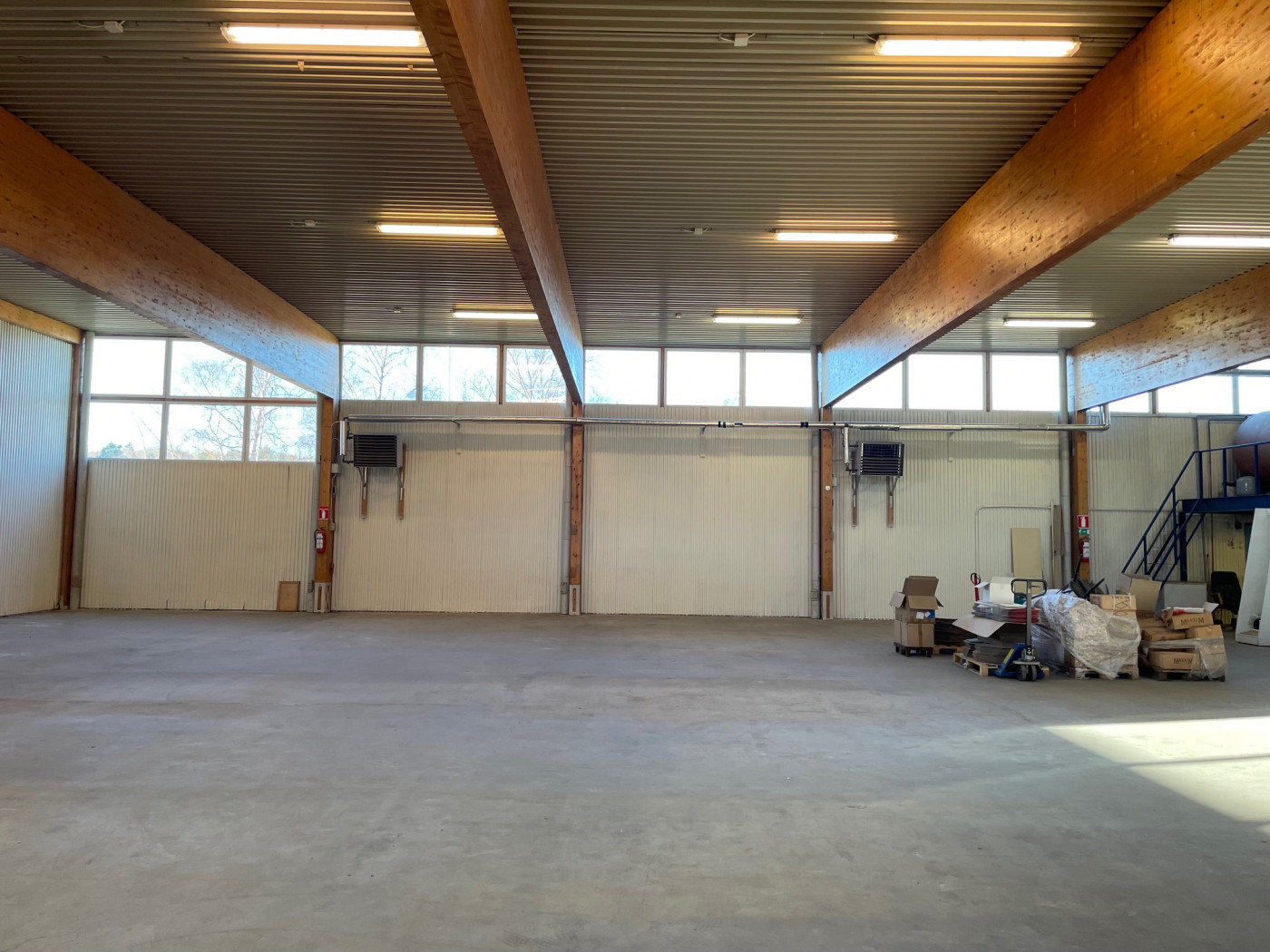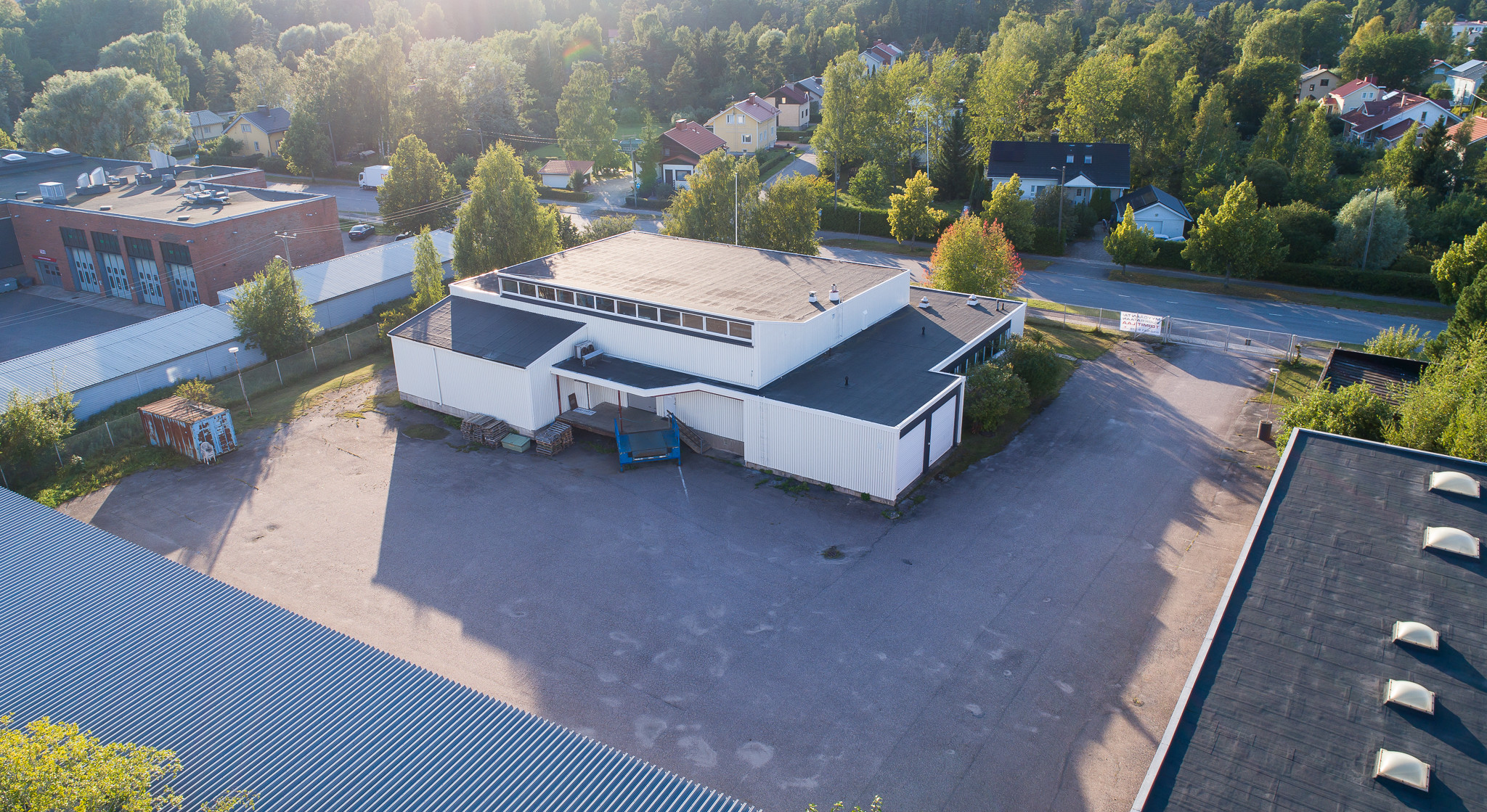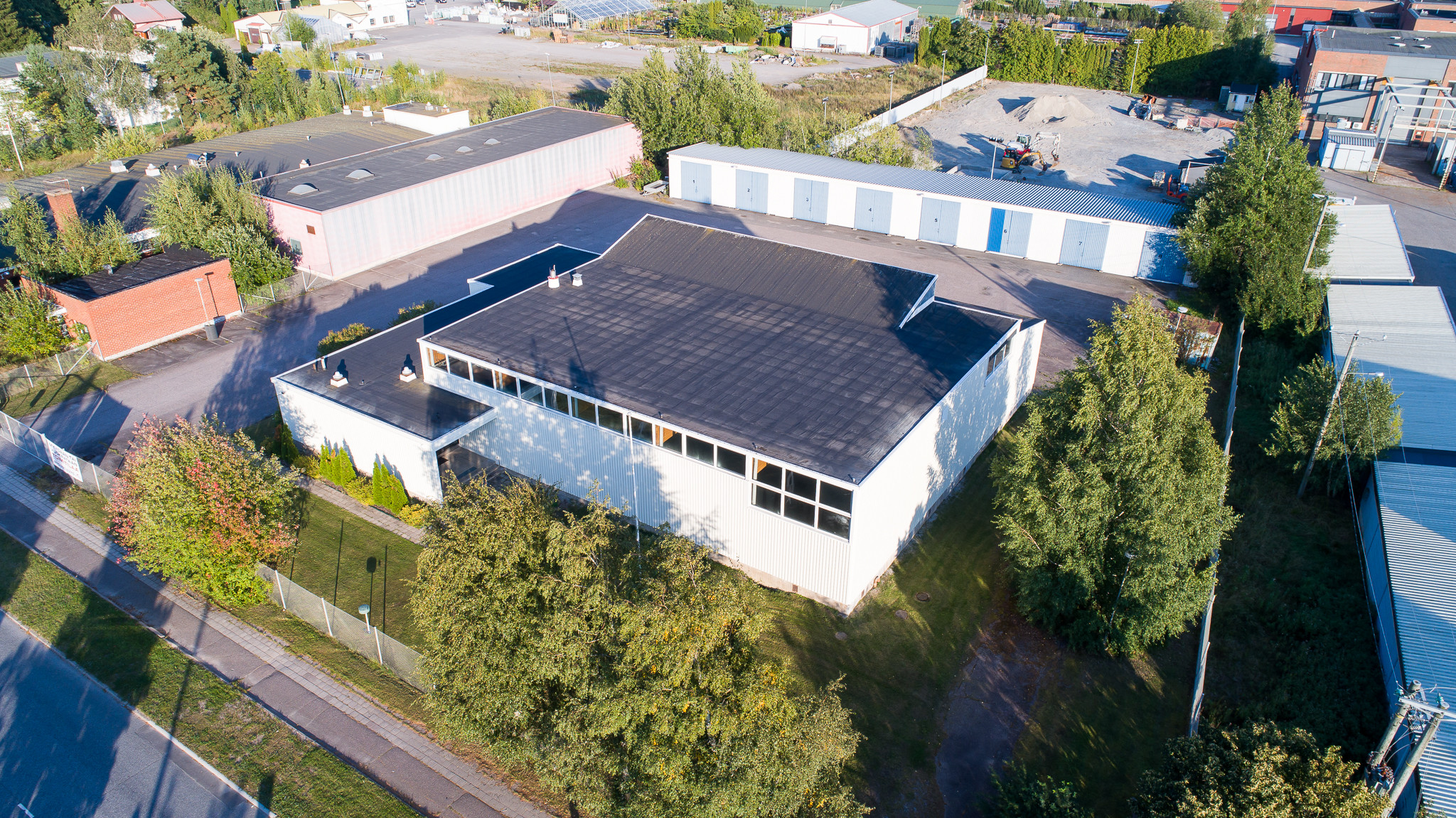 Piha-alueella on erillinen 400 m² peltirakenteinen rakennus, josta puolet on eristetty ja lämmitys hoituu ilmalämpöpumpulla. Vapaa korkeus on 4,1 metriä. Lämpimässä tilassa on yksi nosto-ovi, leveys 3,2 metriä ja korkeus 3,8 metriä. Kylmällä puolella on 4 kpl liukuovia.
