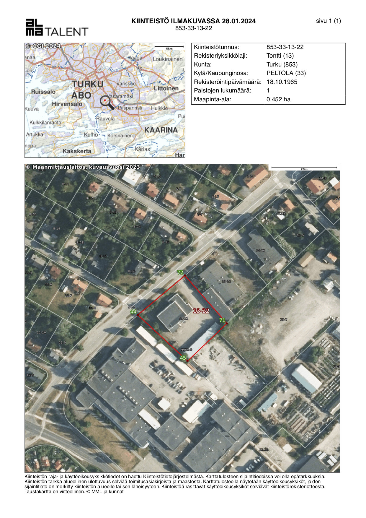 Vuokratontin pinta-ala on 4 520 m². Vuokranantajana Turun kaupunki. Tontti on kauttaaltaan asfaltoitu. Maanvuokrasopimus voimassa 31.05.2029 asti. Turun kaupungilta saatujen tietojen mukaan kaupunki on valmis solmimaan nykyisen sopimuskauden loputtua uuden 30 vuoden maanvuokrasopimuksen.