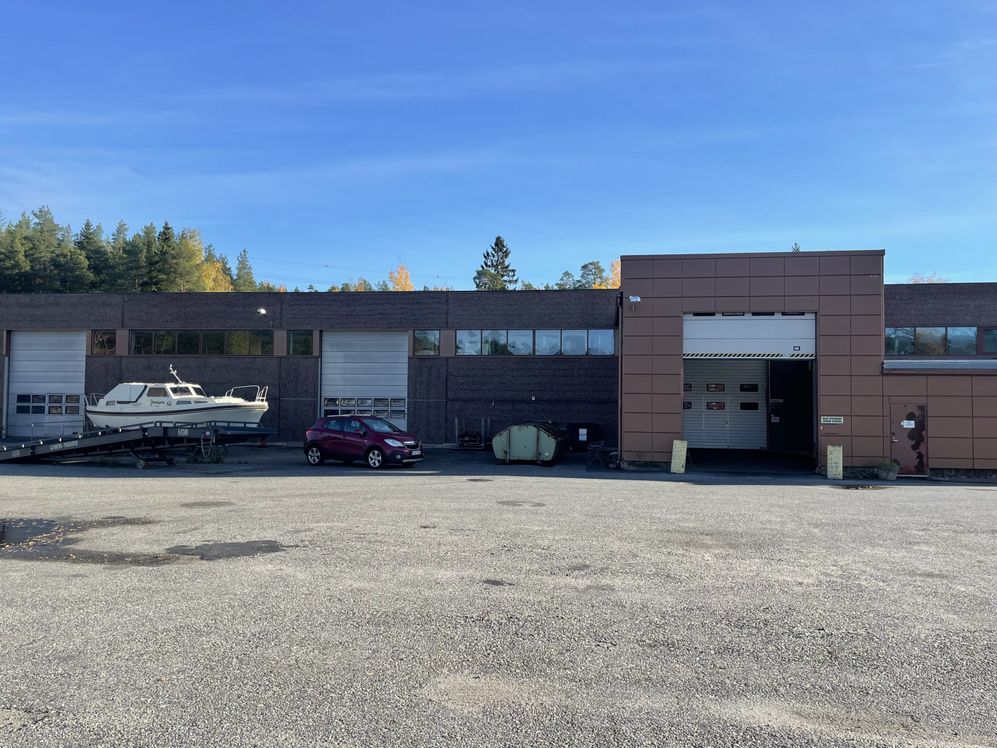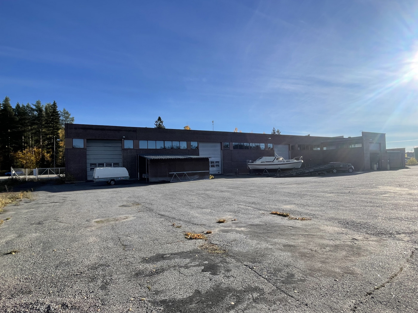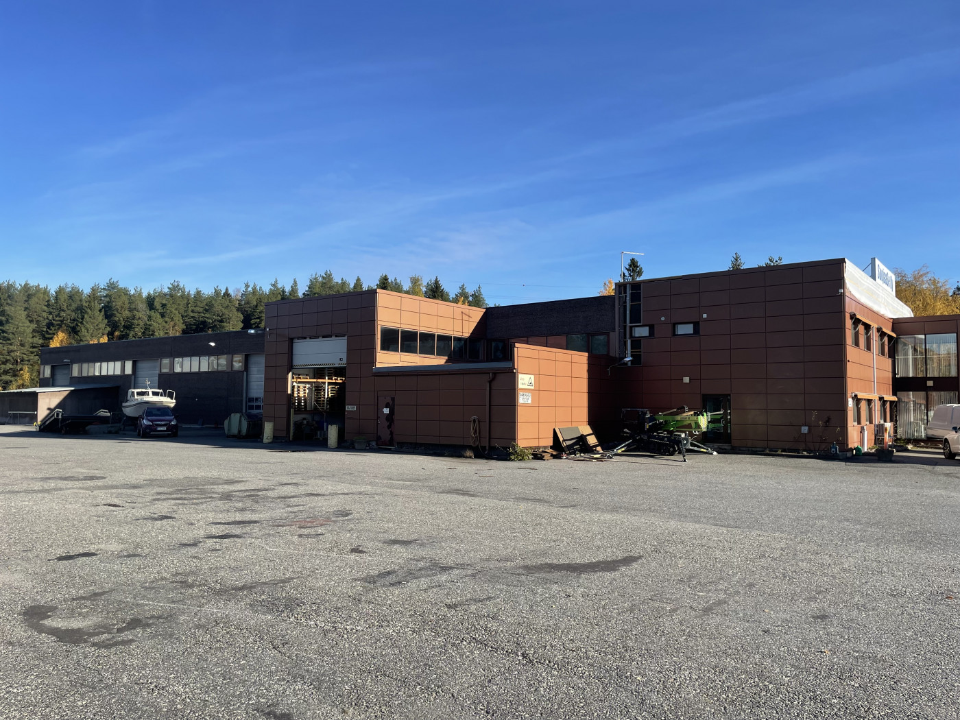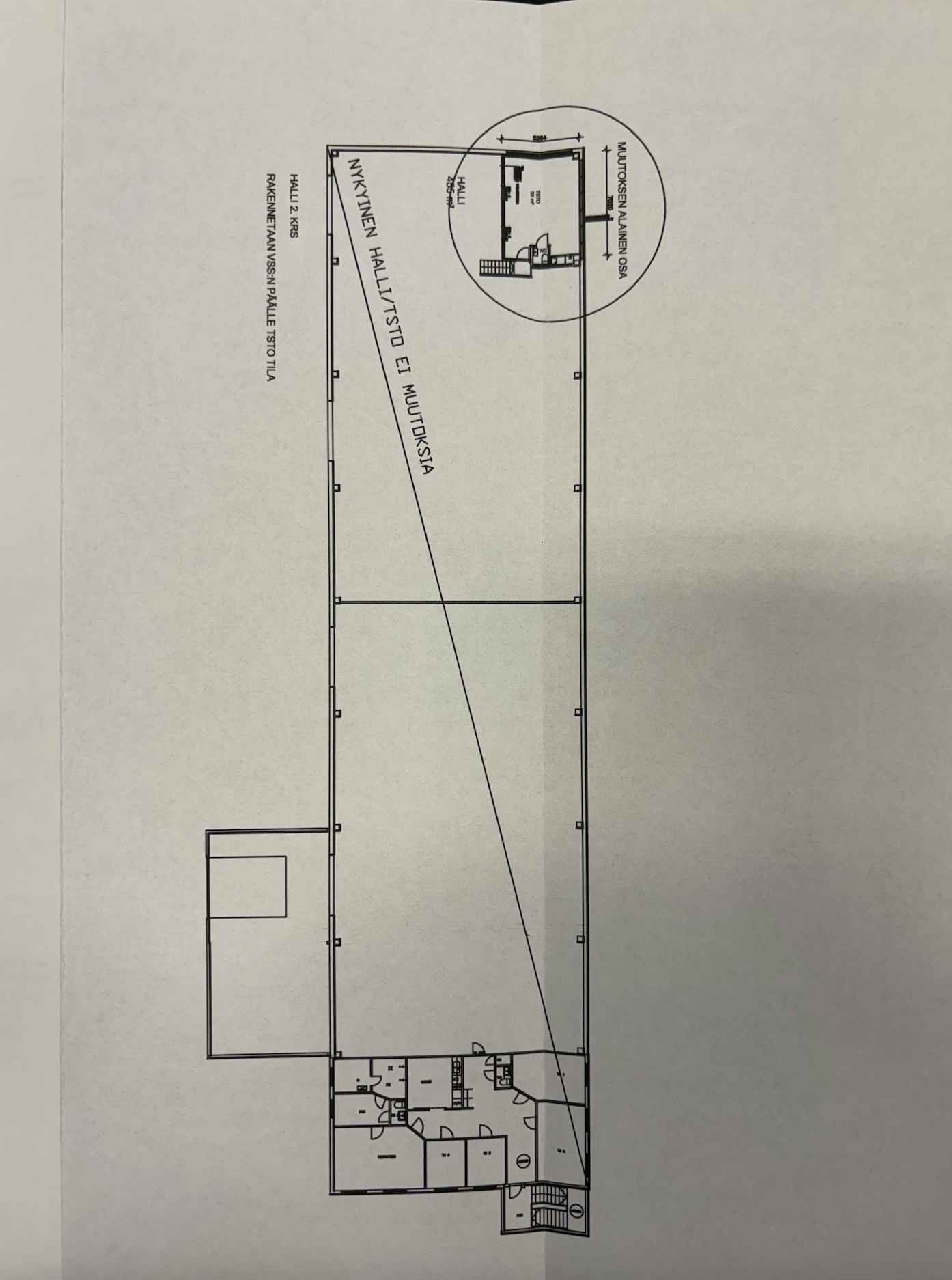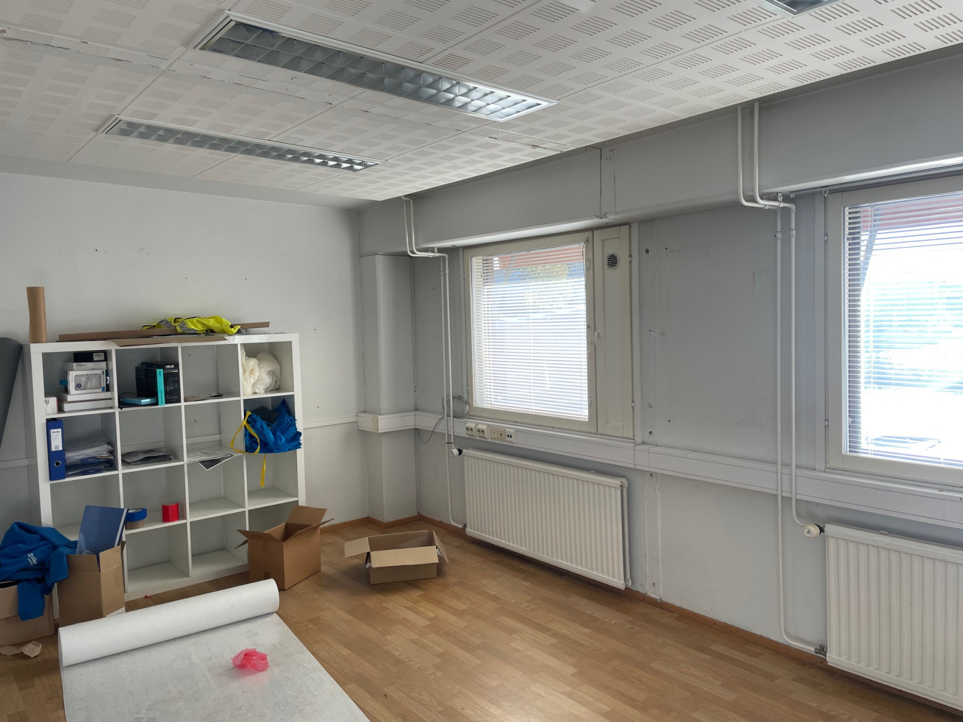 Tilakokonaisuus, jossa noin 6,5 metriä korkean hallin lisäksi hallin päädyssä n. 300m2 toimisto- ja sos. tiloja kahdessa kerroksessa. Yläkerran toimistossa tällä hetkellä peruskorjaus menossa, valmistuu loppuvuodesta 2024.
