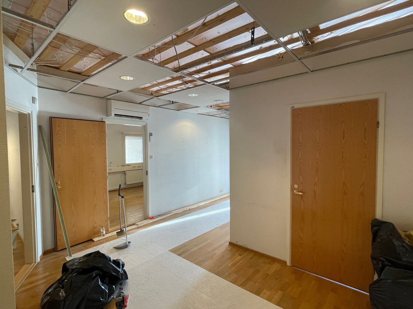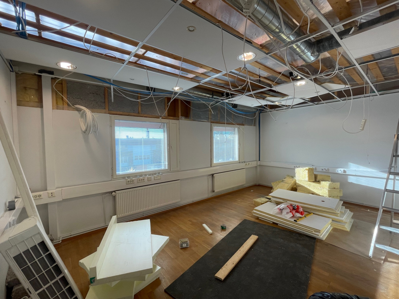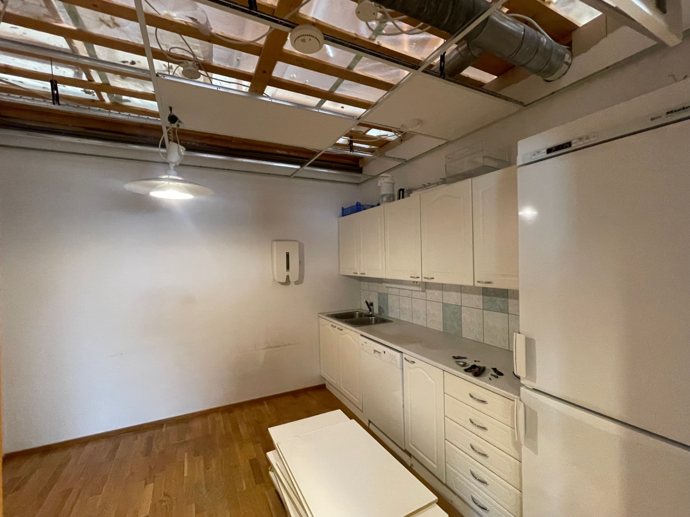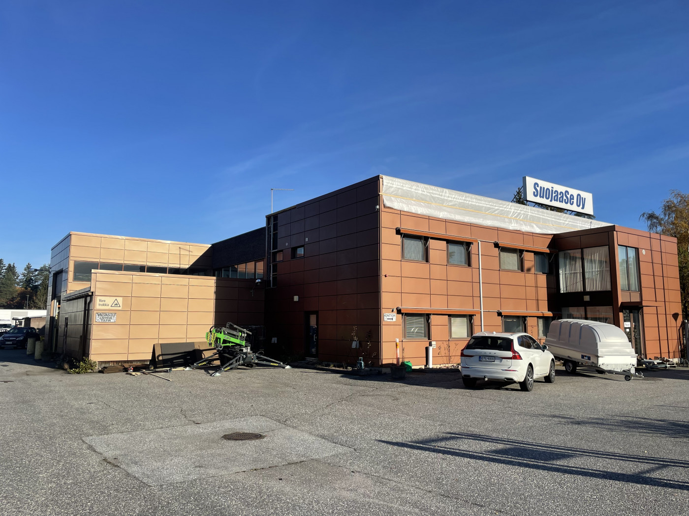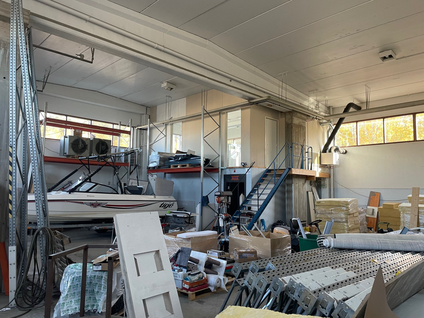 Tilakokonaisuus, jossa noin 6,5 metriä korkean hallin lisäksi hallin päädyssä n. 300m2 toimisto- ja sos. tiloja kahdessa kerroksessa. Yläkerran toimistossa tällä hetkellä peruskorjaus menossa, valmistuu loppuvuodesta 2024.