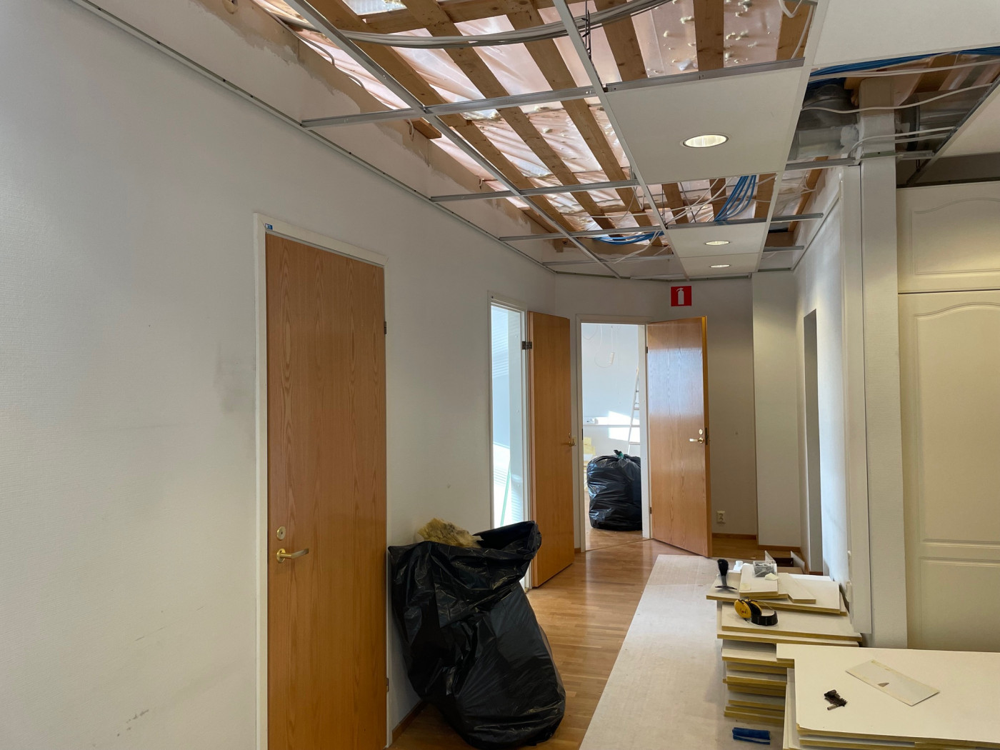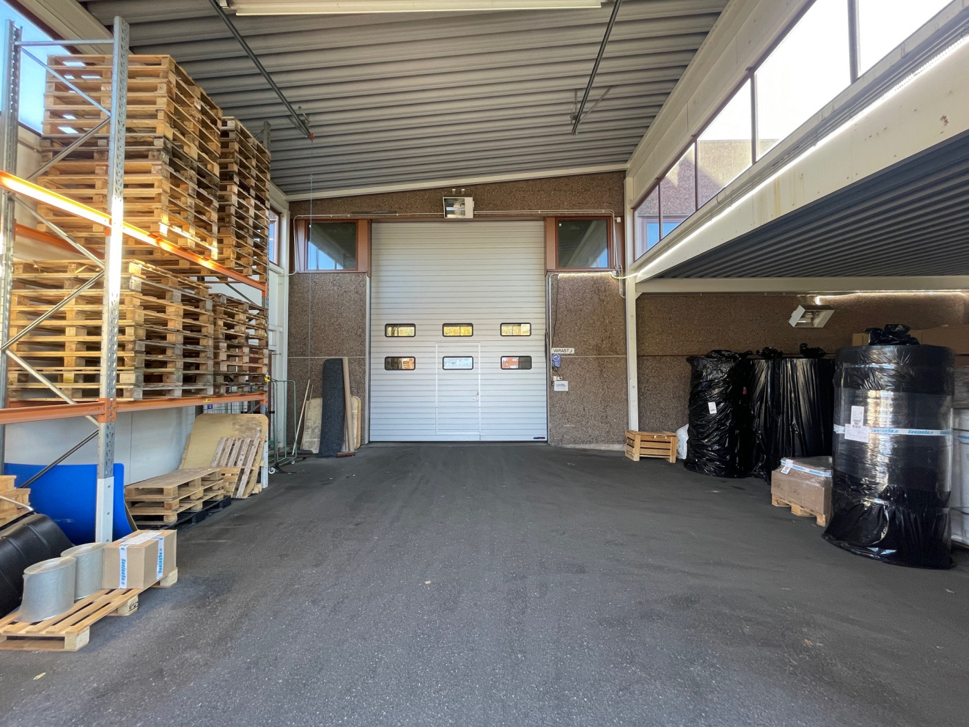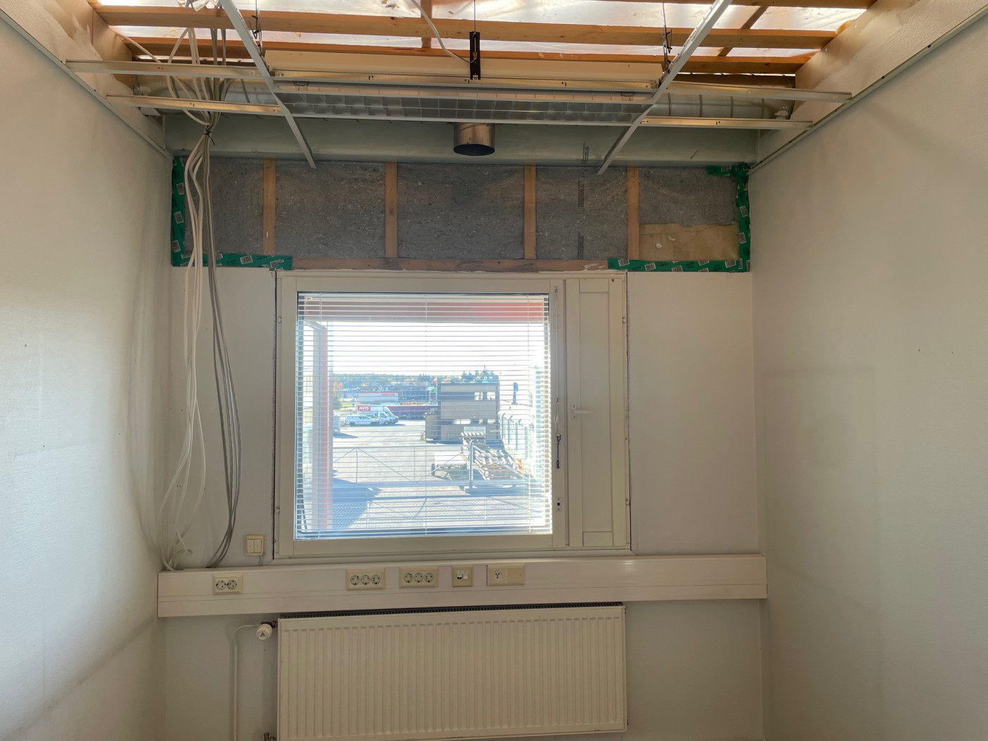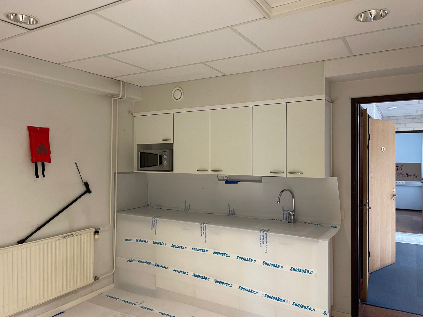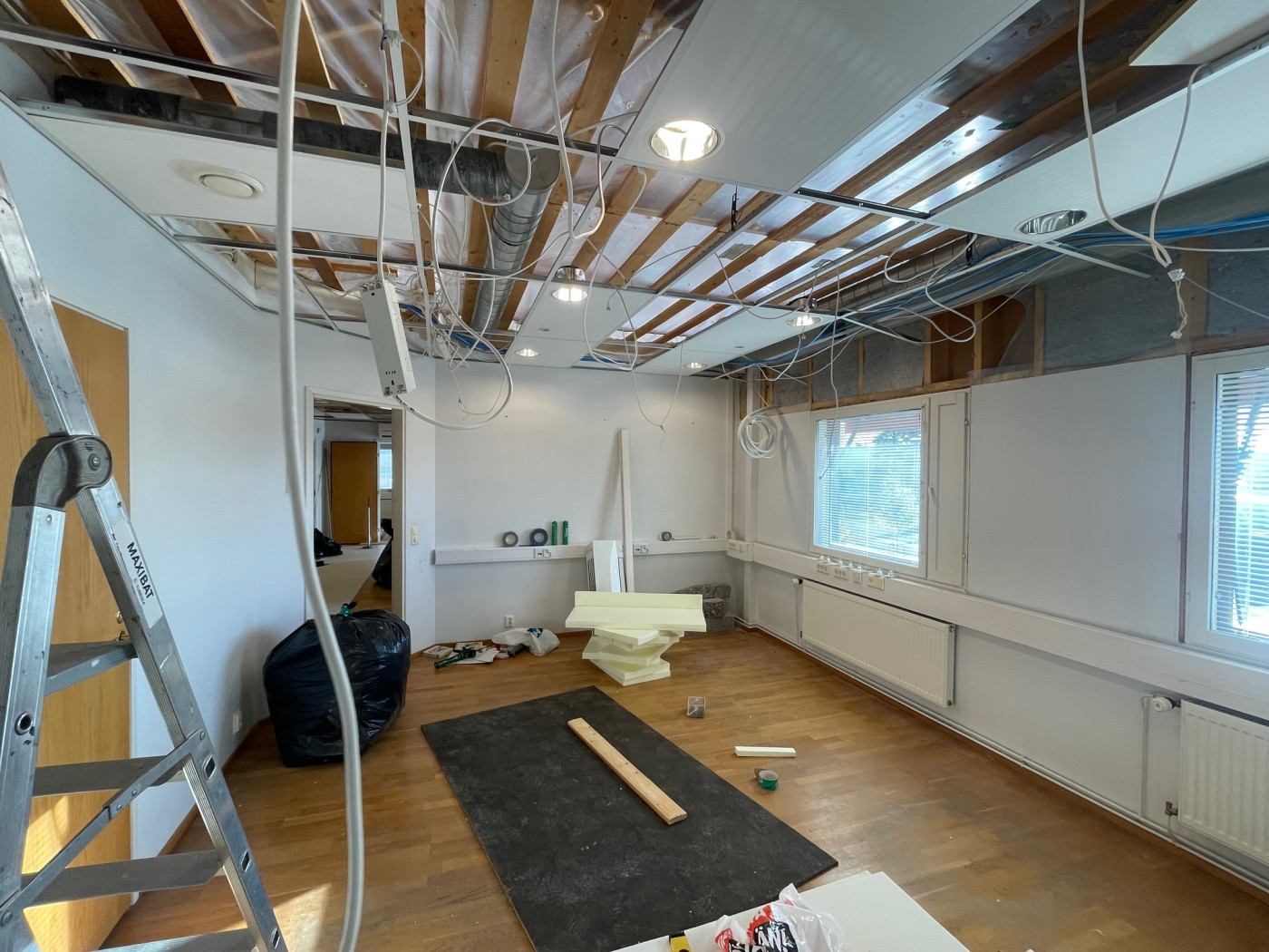 Tilakokonaisuus, jossa noin 6,5 metriä korkean hallin lisäksi hallin päädyssä n. 300m2 toimisto- ja sos. tiloja kahdessa kerroksessa. Yläkerran toimistossa tällä hetkellä peruskorjaus menossa, valmistuu loppuvuodesta 2024.