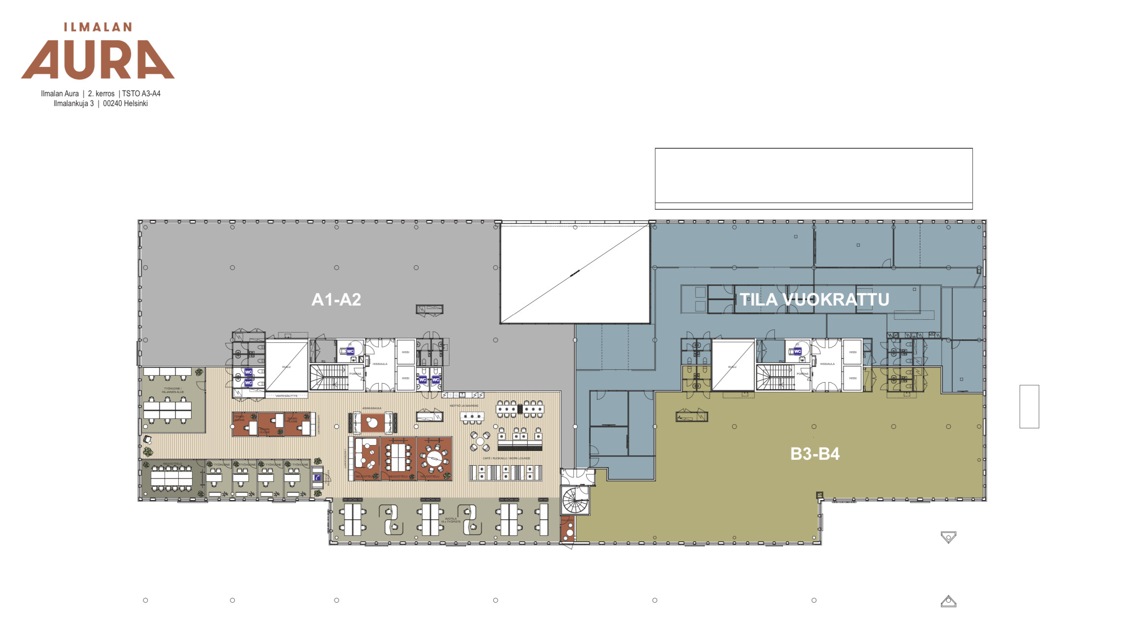 Kesällä 2024 valmistuneessa Ilmalan Aurassa avautuu huikea mahdollisuus: 575,5 m² modernia toimistotilaa, joka odottaa juuri teitä.Tämä tilaihme toisessa kerroksessa yhdistää kaiken, mitä toimiva työympäristö vaatii: avotilaa tiimin yhteistyöhön, teams-huoneet tärkeisiin etäpalavereihin, hiljainen alue syvää keskittymistä varten sekä tietenkin raikkaat ja tyylikkäät WC-tilat.