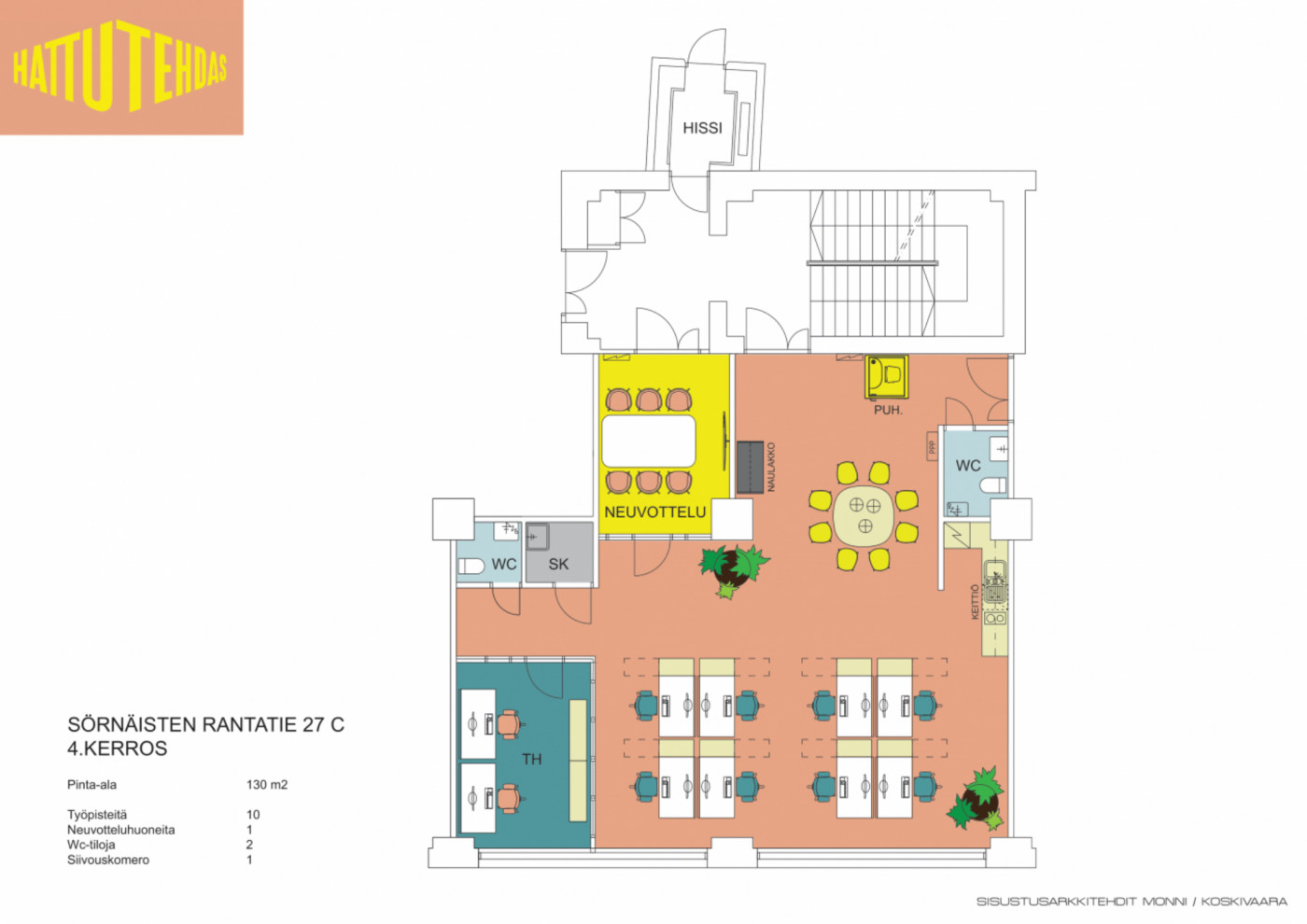 Vuokrataan persoonallinen 130 m2 toimistotila Hattutehtaan 4. kerroksessa. Selkeä ja toimiva pohjaratkaisu, jossa avotilaa työpisteille sekä pari vetäytymistilaa (työhuone ja neuvottelutila). Tila on valoisa ja ikkunoista avautuu näkymät Vilhonvuorenkadulle, Suvilahden ja Kalasataman suuntaan.