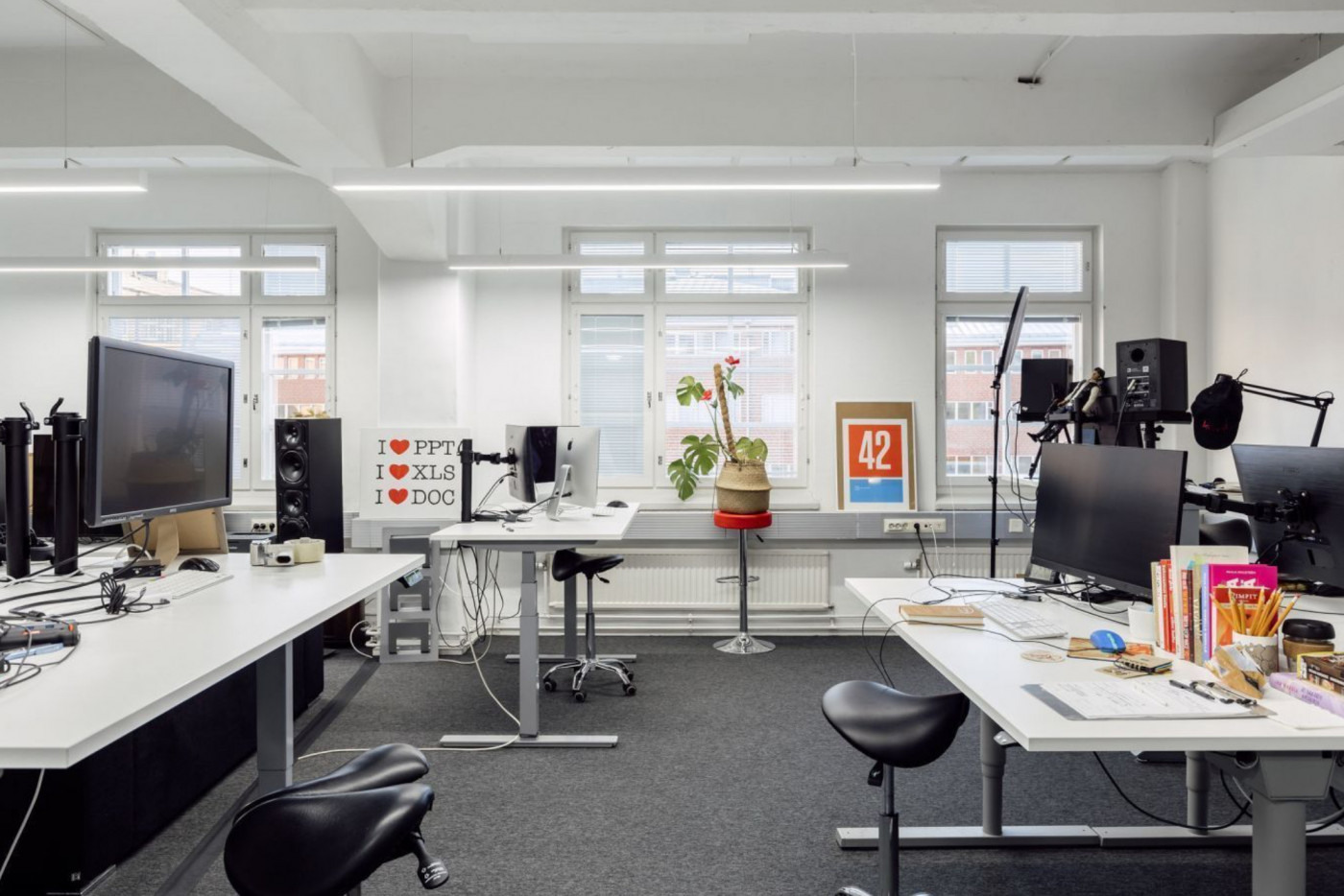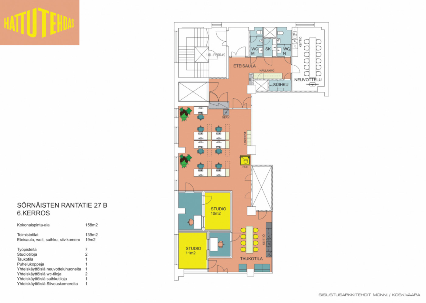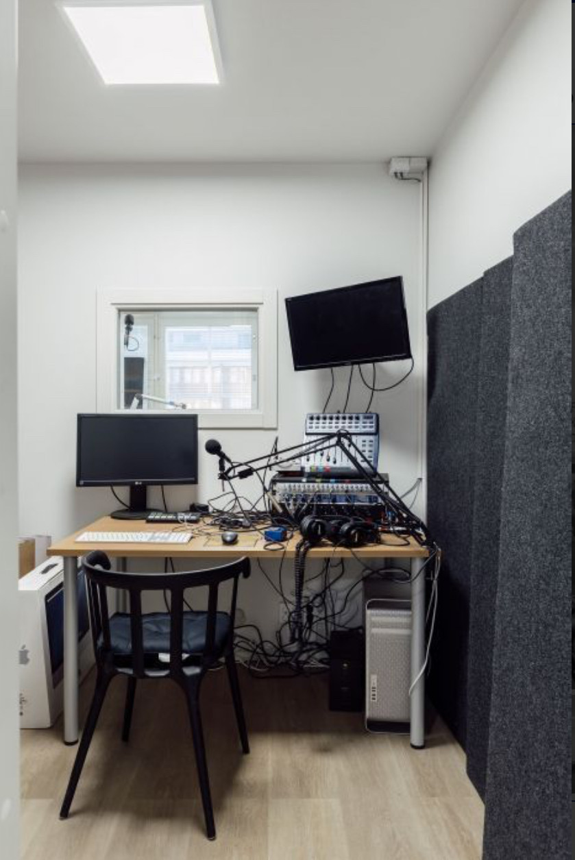 Tila sijaitsee Hattutehtaan D-portaan 6. kerroksessa. Toimistolla on naapuritoimiston kanssa yhteinen sisääntuloaula (johon tulee myös tavarahissi sisäpihalta), jonka yhteydessä on useampi vessa sekä suihku. Tila on remontoitu muutama vuosi sitten, jolloin tilaan rakennettiin kaksi studiotilaa tarkkaamohuoneineen. Nämä tilat muuntuvat myös neuvotteluhuoneiksi sekä pieniksi työhuoneiksi. Muutoin tila on avotilaa. Näkymät ovat idylliselle sisäpihalle, eli erittäin rauhallinen toimisto. Tila vapautuu sopimuksen mukaan.