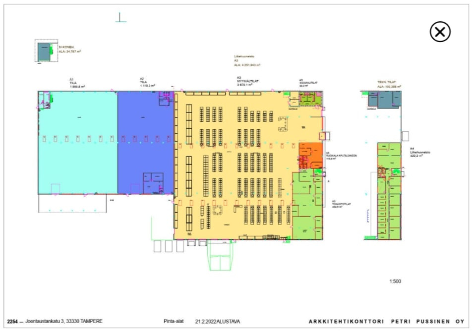 Tampereen Myllypurossa vuokrattavissa tuotanto-, logistiikka- tai varastokäyttöön kelpaavaa tilaa. Tila on jaettavissa. Pohjakuvassa tila A1 1569 m2 ja A2 1119,5 m2. Vapaa korkeus n. 5-7m. Suuri tasainen piha-alue mahdollistaa rekan kääntymisen tai isommankin ulkovarastoinnin. Lisätiedot: 045 610 2752 tai mikko.wallgren@rhg.fi Lisää kohteita www.rhg.fi