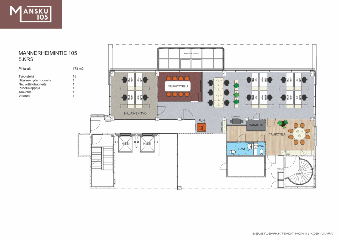 Helsingin Mannerheimintie 105 on moderni toimistokiinteistö näkyvällä ja helposti saavutettavalla paikalla Mannerheimintien loppupäässä Ruskeasuolla. Työmatkaliikenne tähän kohteeseen on vaivatonta, sillä lukuisat bussit kulkevat talon edestä Mannerheimintieltä. Myös raitiovaunulinja 10:n pysäkki on talon kulmalla. Autolla Mansku 105:een on kätevää tulla, sillä kiinteistö sijaitsee pääväylien risteyskohdassa. Auton saa helposti parkkiin talon alla sijaitsevaan pysäköintihalliin.