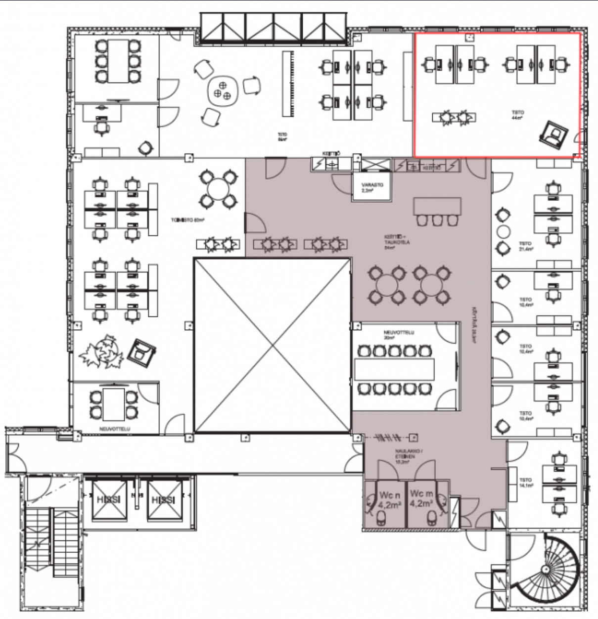 Vuokrataan 4. kerroksen 44m2 toimistotila Mansku105:n toimistohotellista. Yhteiskäytössä muiden toimistohotellin vuokralaisten kanssa keittiö, wc:t ja lounge/taukotila.