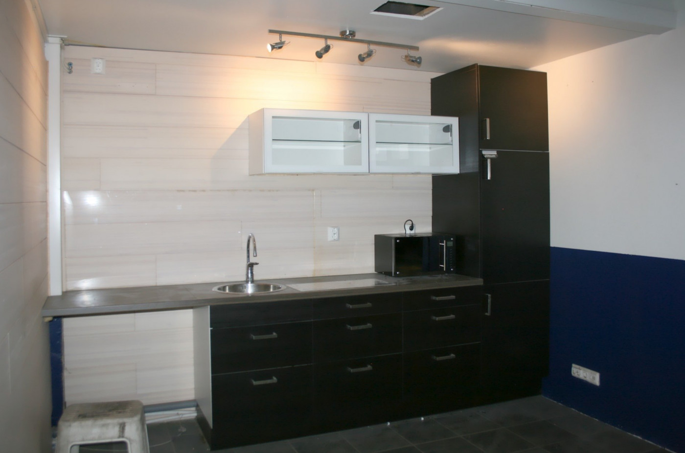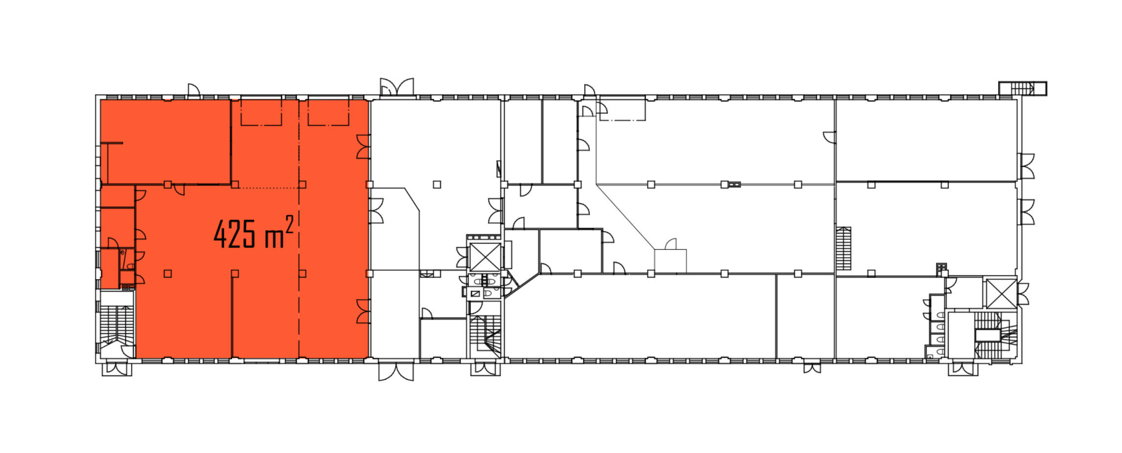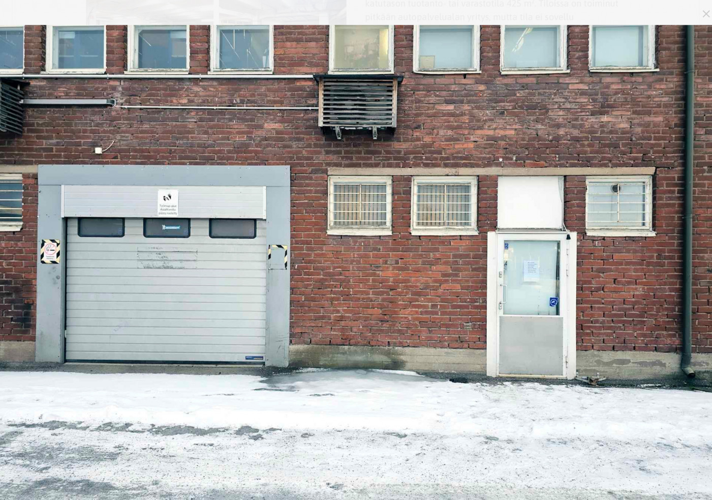 Vuokrataan perinteikkäästä teollisuusmiljööstä läpiajettava katutason tuotanto- tai varastotila 425 m². Tiloissa on toiminut pitkään autopalvelualan yritys, mutta tila ei sovellu autopesulaksi. Tilan korkeus on noin 3 m ja sinne johtaa pihalta kaksi omaa nosto-ovea ja taitto-ovi. Mainio keittiö. Aulassa hauska ruutulattia, sopii esim. asiakkaiden vastaanottamiseen. Pohjapiirrokseen katkoviivalla merkitty kevyt väliseinä voidaan purkaa tarvittaessa.