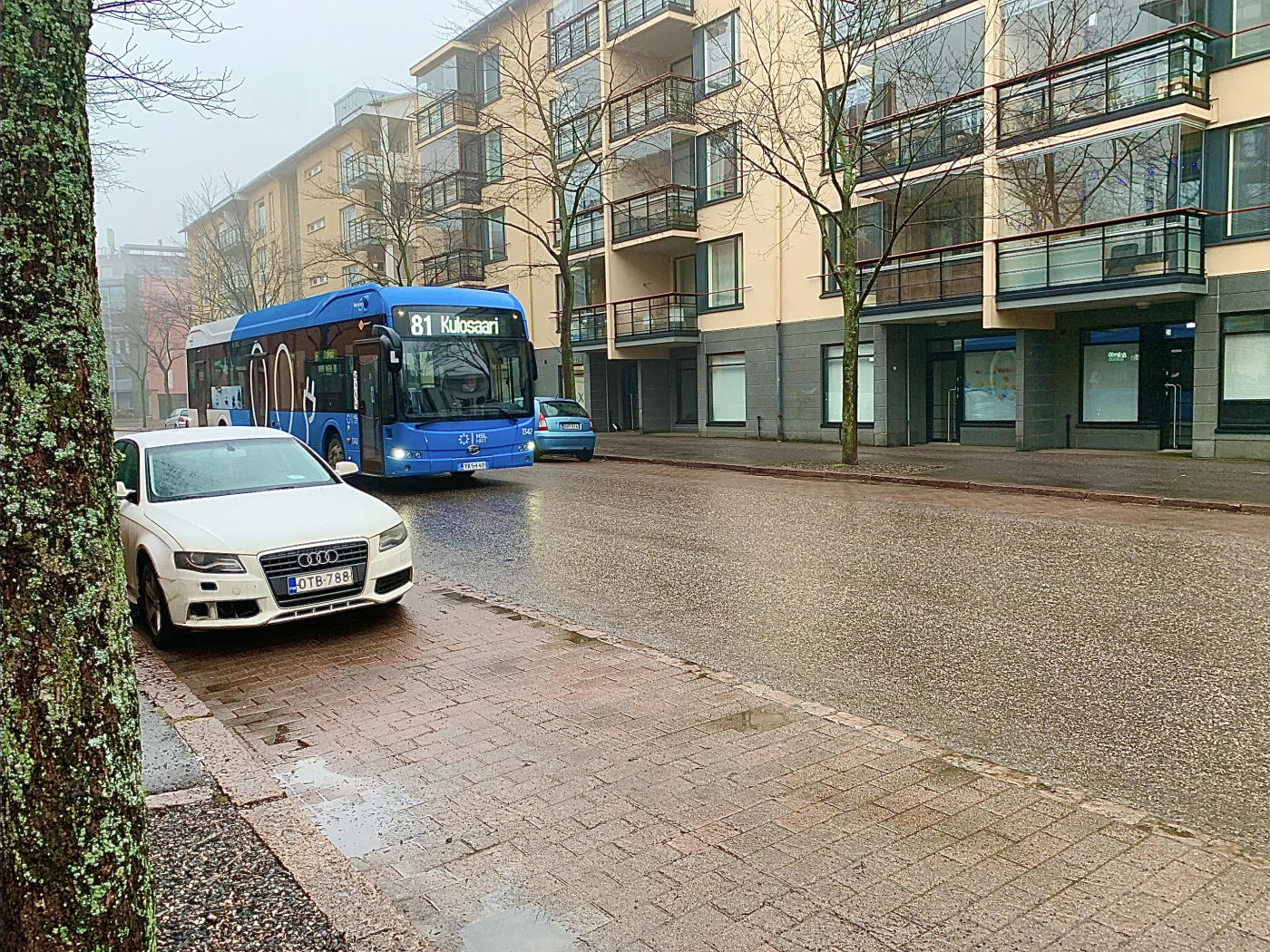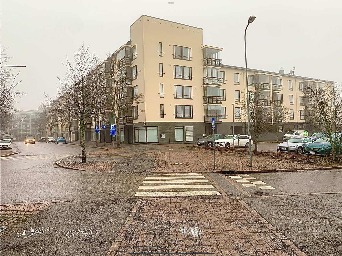 Näkyvä sijainti ja loistava saavutettavuus - bussi nro 81 pysähtyy suoraan oven eteen. Kadun varrella pysäköintipaikkoja.
