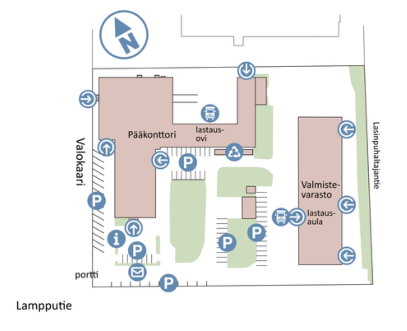 Varasto-osaan on kätevä kulku myös pihalta nosto-oven kautta (leveys 3 m, korkeus 2,5 m). Toimitila sijaitsee rakennuksen kadun puoleisessa osassa, jonka näyttävä julkisivu tarjoaa erinomaisen näkyvyyden ohikulkuliikenteelle. Kiinteistön pihassa on runsaasti vinoparkkipaikkoja asiakkaiden ja henkilöstön käyttöön.