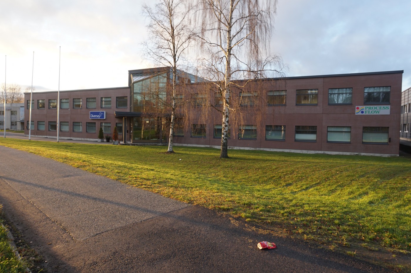 Rakennuksen seinustalla sijaitsevat tilaan kuuluvat autopaikat.