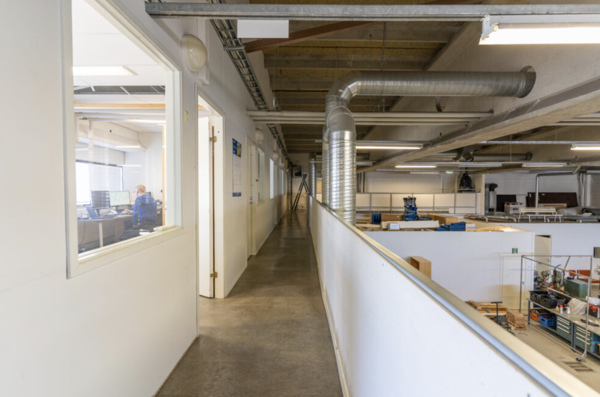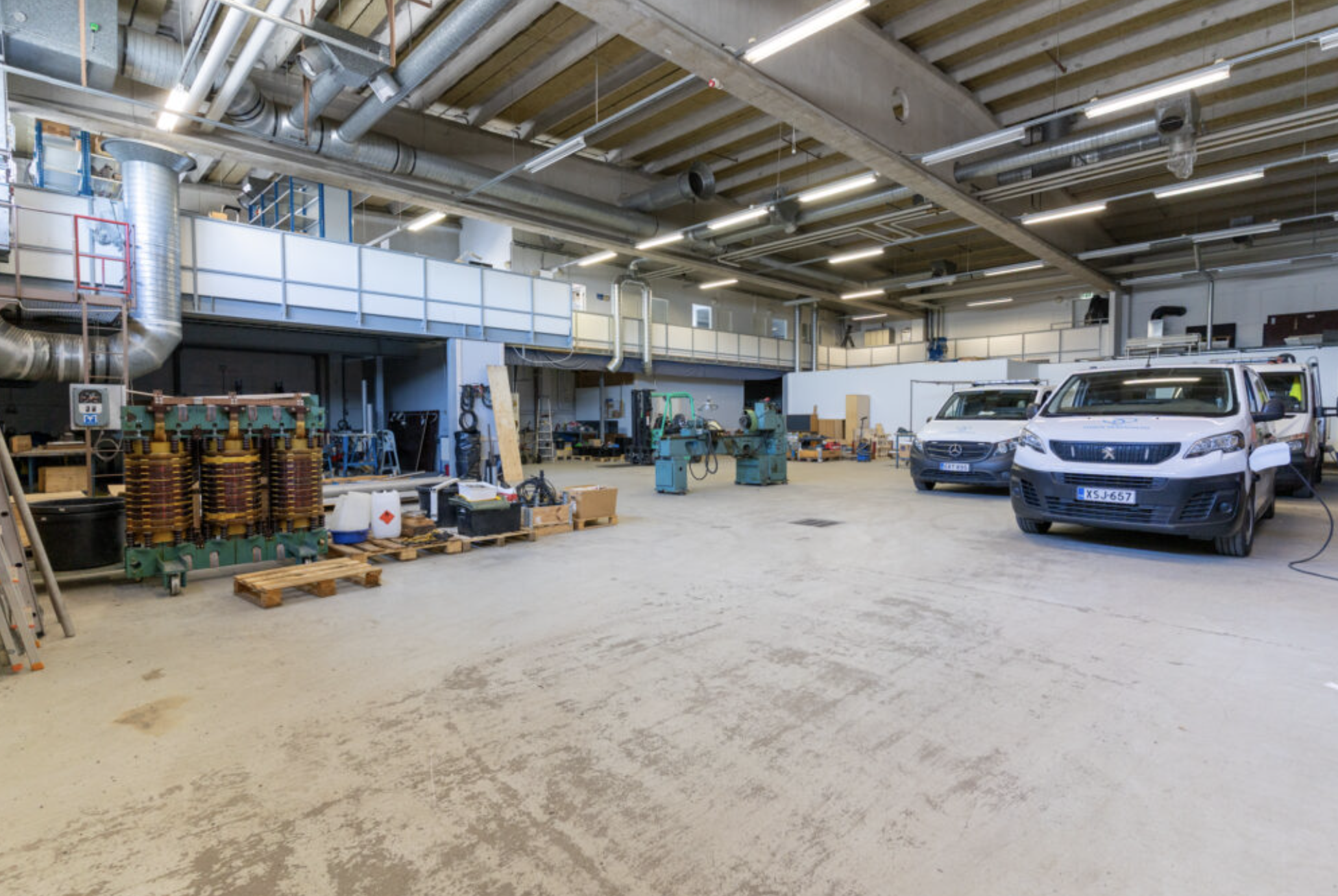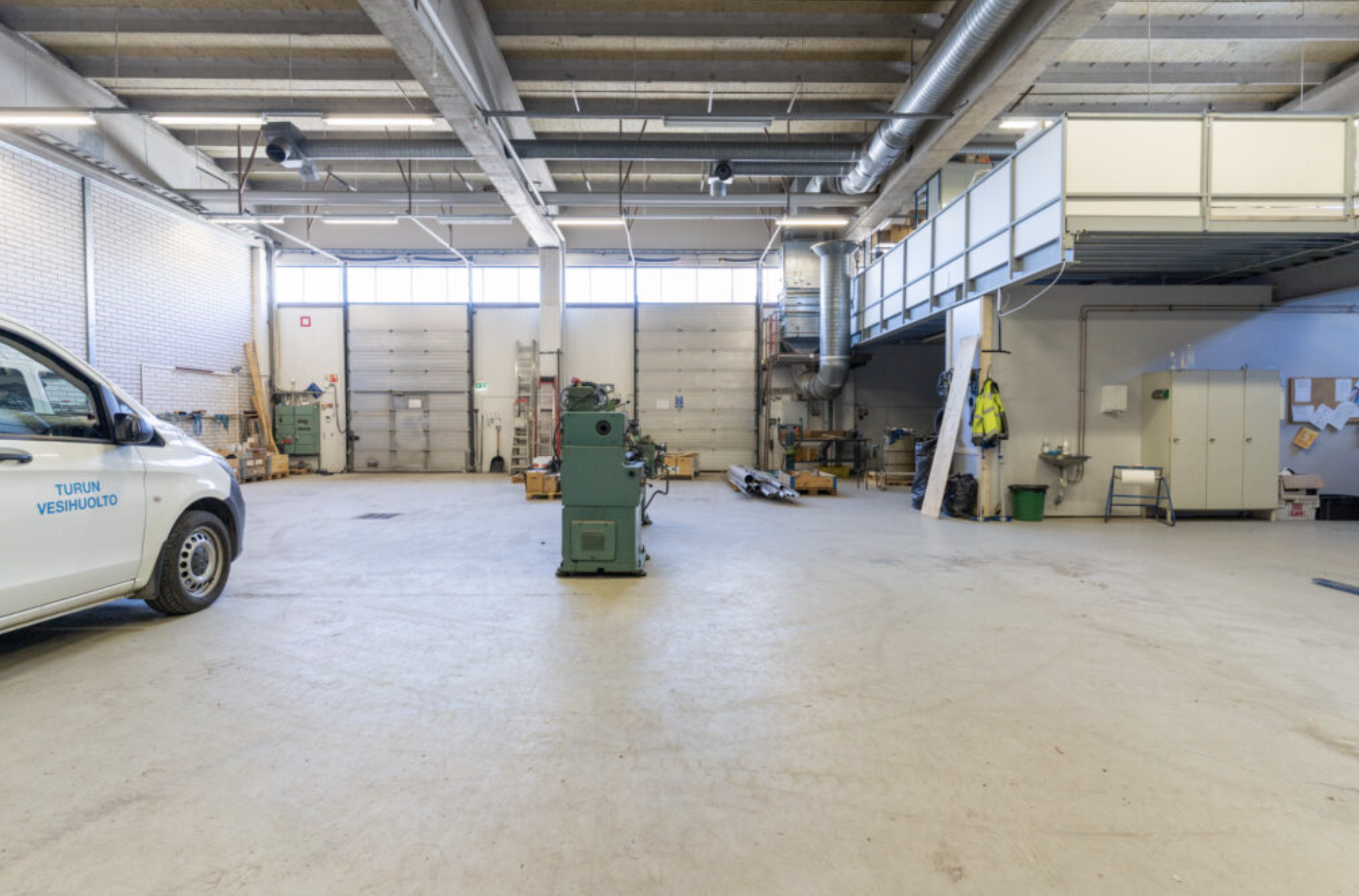 Tilakokonaisuuteen kuuluu korkea hallitila sekä yläkerran parvitilan toimistohuoneet, joissa on myös keittiö. Tilaan on oma sisäänkäynti ja kaksi nosto-ovea.