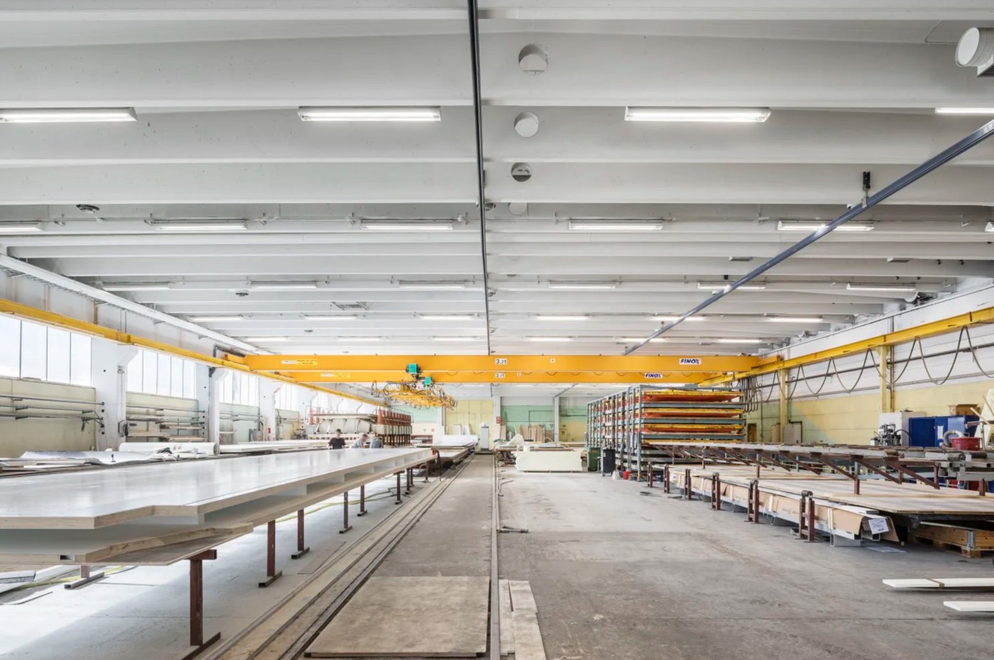 Rakennuksessa on kolme hallia, joissa suuret nosto-ovet ja siltanosturit: