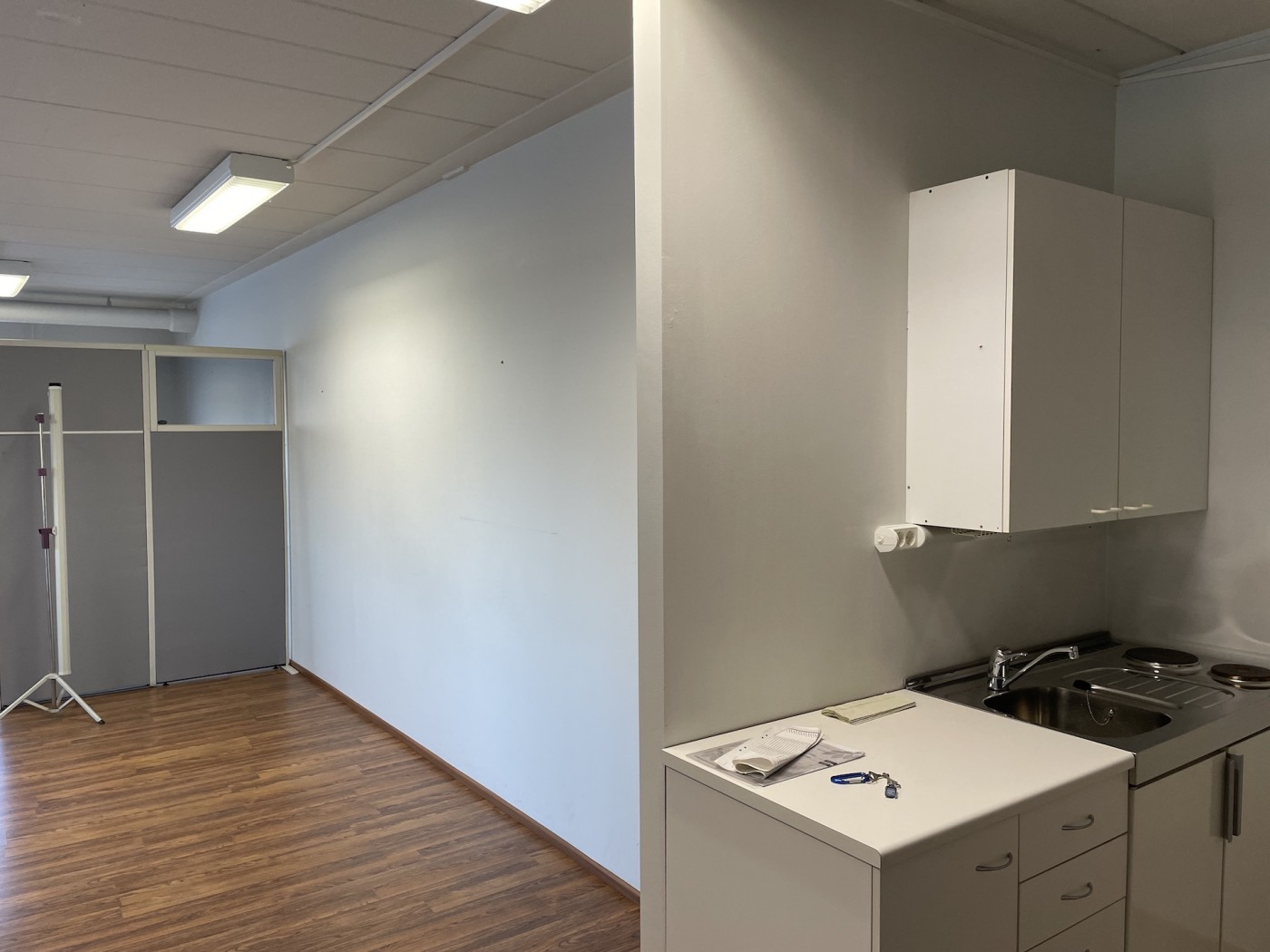 Tilakokonaisuus käsittää avotilan lisäksi avokeittiön, WC:n ja pienen huoneen/varaston.