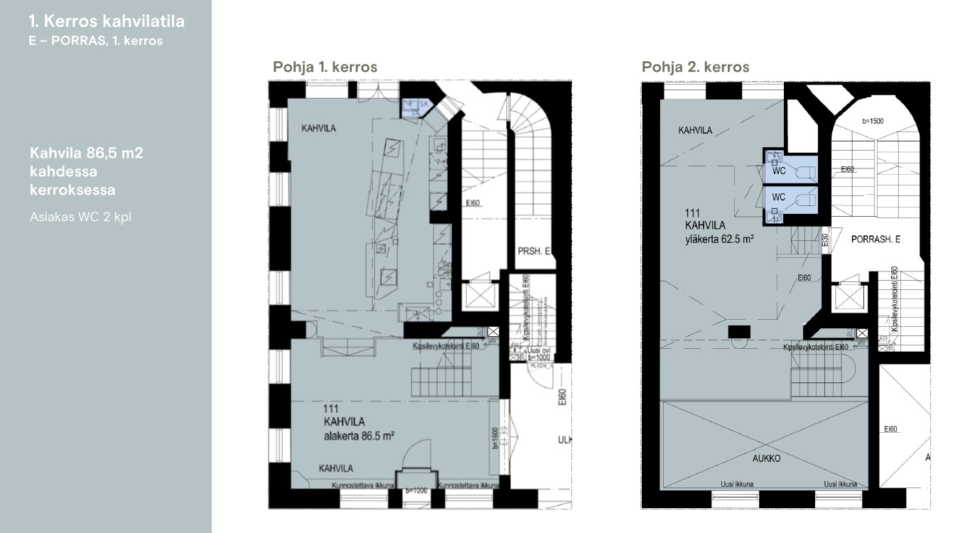 Tilakokonaisuus koostuu katutason 86,5 m² tilasta sekä toisen kerroksen (2. krs) 62,5 m² asiakastilasta.