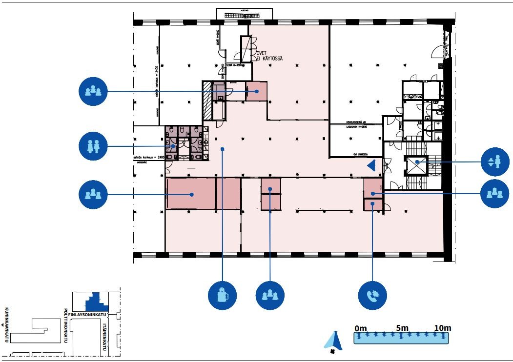 Toimistotila osoitteessa Finlaysoninkatu 5. Toimistotilaa kolmannen kerroksen kahteen suuntaan avautuvilla näkymillä. Tila on tällä hetkellä jaettu kolmeen suurempaan toimistoalueeseen, joiden lisäksi on muutama neuvotteluhuone. Oma keittiötila ja useampi WC. Tilaratkaisu suunnitellaan vuokralaisen tarpeen mukaan.