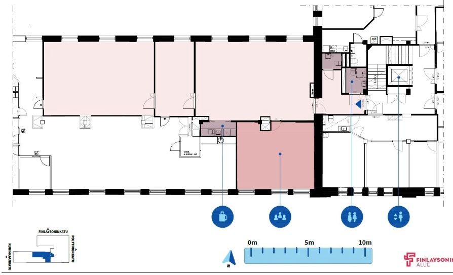 Tilassa omat wc-tilat ja keittonurkkaus sekä neuvotteluhuone.