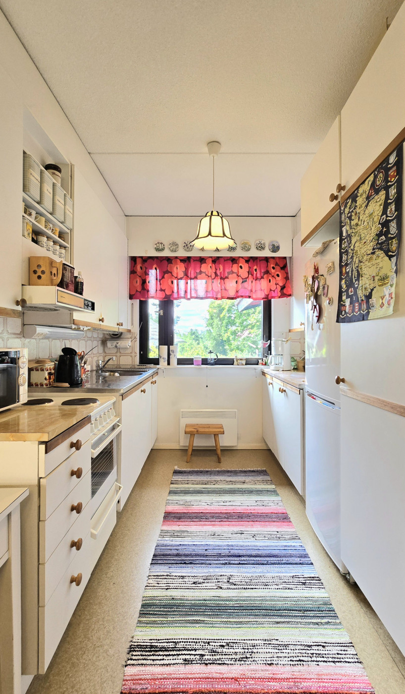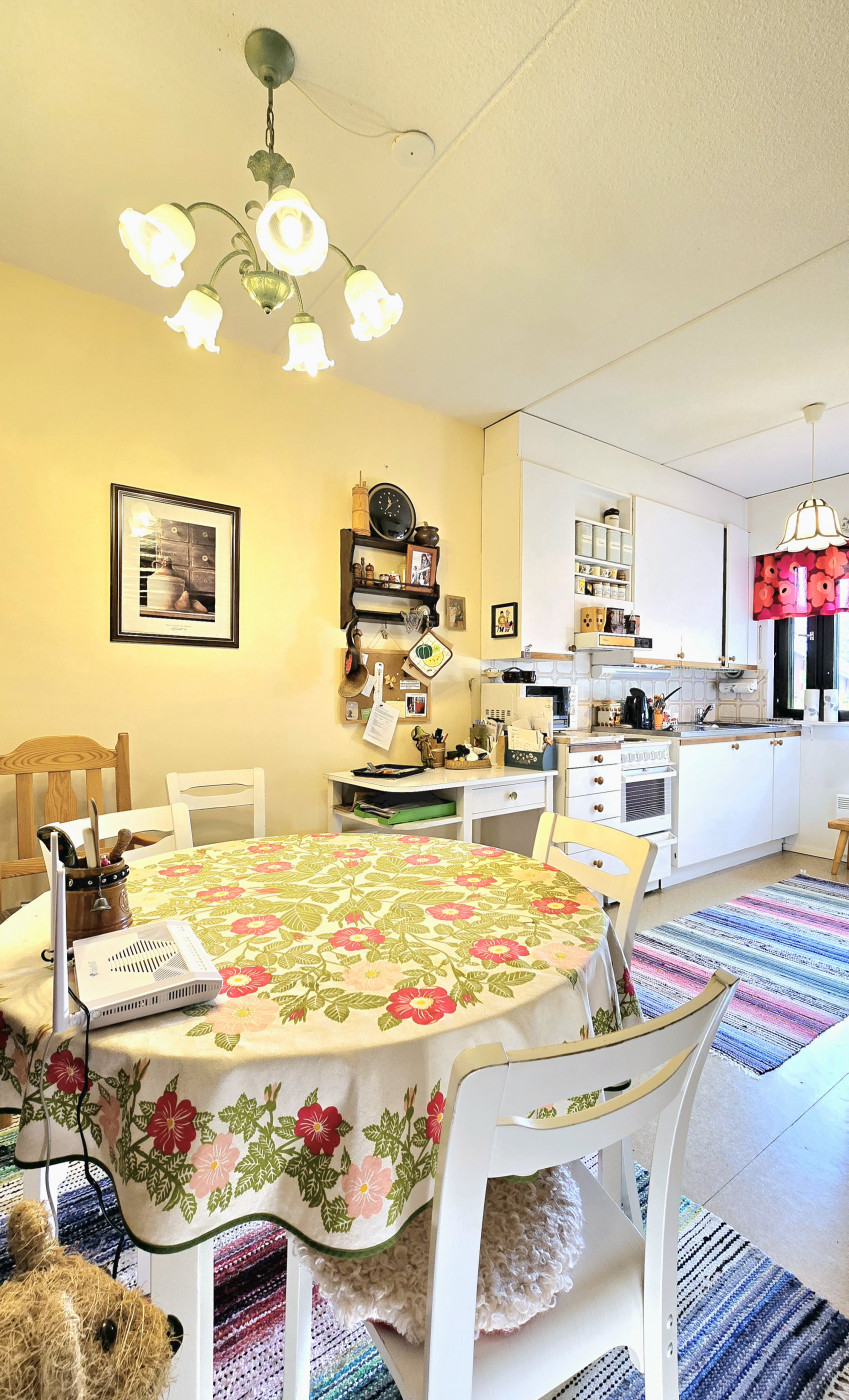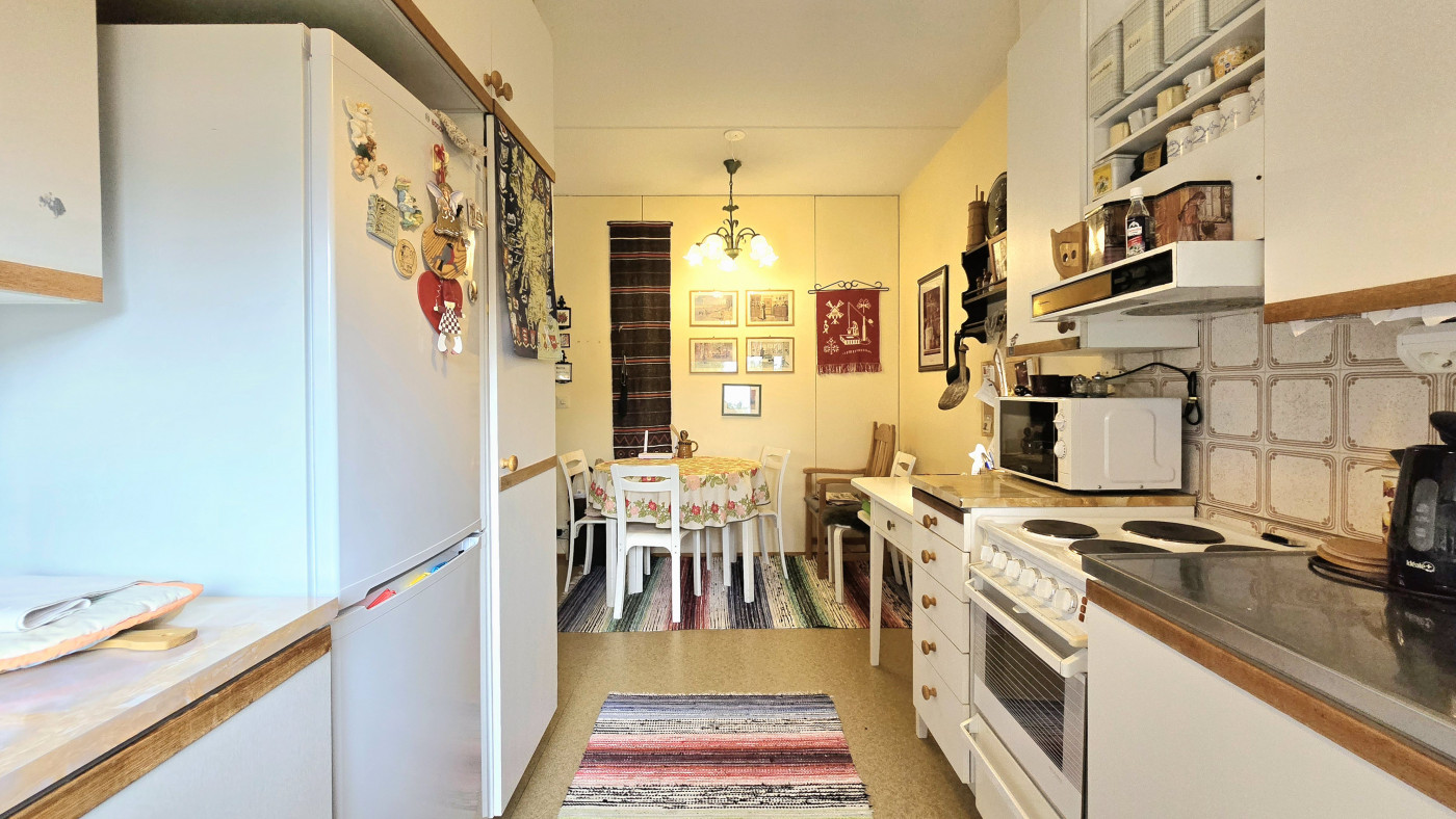 | Keittiö | Jää/pakastinyhdistelmä, sähköliesi, liesituuletin ja vaaleat siistit keittiökaapistot sekä tilaa myös keittiöpöydälle. Huoneiston lattioissa muovimattopinnat ja seinäpinnat maalatut tai tapetoidut. |
