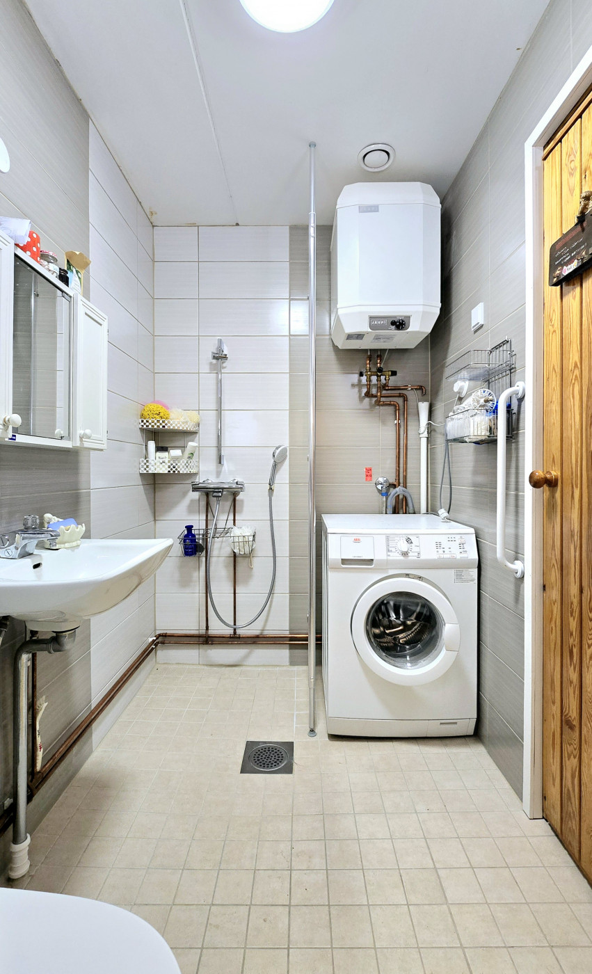| Kylpyhuone | Erillisissä vuonna 2017 remontoiduissa sauna- ja pesuhuonetiloissa sähkökiuas, lauteet, suihku, suihkuseinä, allas yläpeilikaapistoin, wc-istuin, pide, lämminvesivaraaja, pyykinpesukone, vedeneristys, lattialämmitys ja pesukoneliitäntä. Pinnat paneelia tai laattaa. |