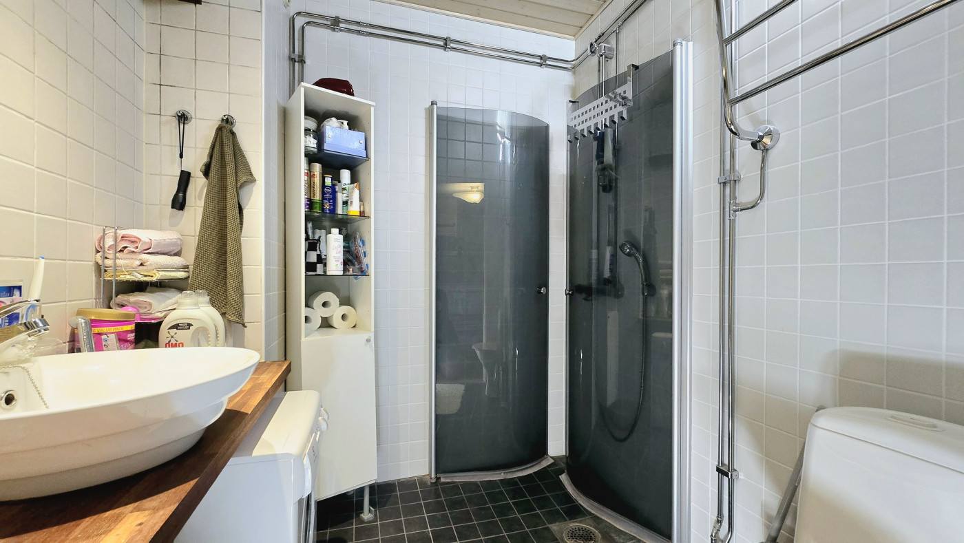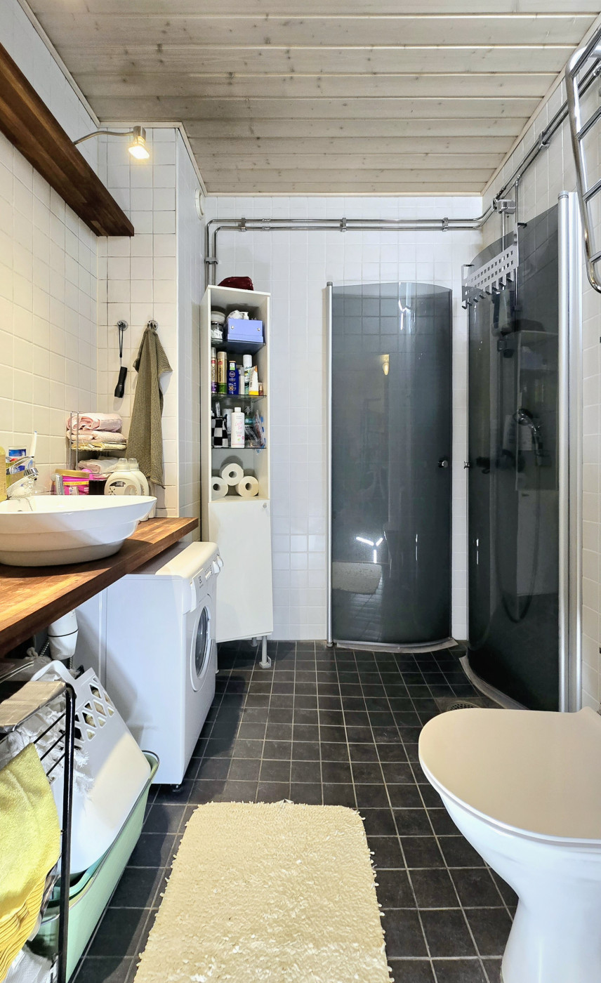 | Kylpyhuone | Tilavassa kauttaaltaan laatoitetussa ja vuonna 2014 LATTIALÄMMITYKSIN näyttäväksi remontoidussa kylpyhuoneessa suihku, kääntyvät suihkuseinämät, kaunis malja-allas sekä teak-pöytäpinnat, pyyhkeiden kuivausteline (taloyhtiön vesikierto), wc-istuin, pesukoneliitäntä, vedeneristys ja käyttövesiputket myös uusittu PINTAAN sekä asennettu paneelit sisäkattoon. |