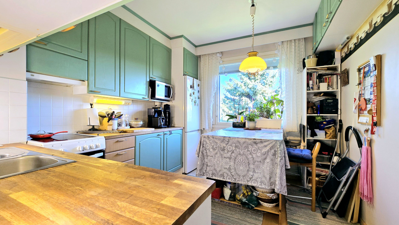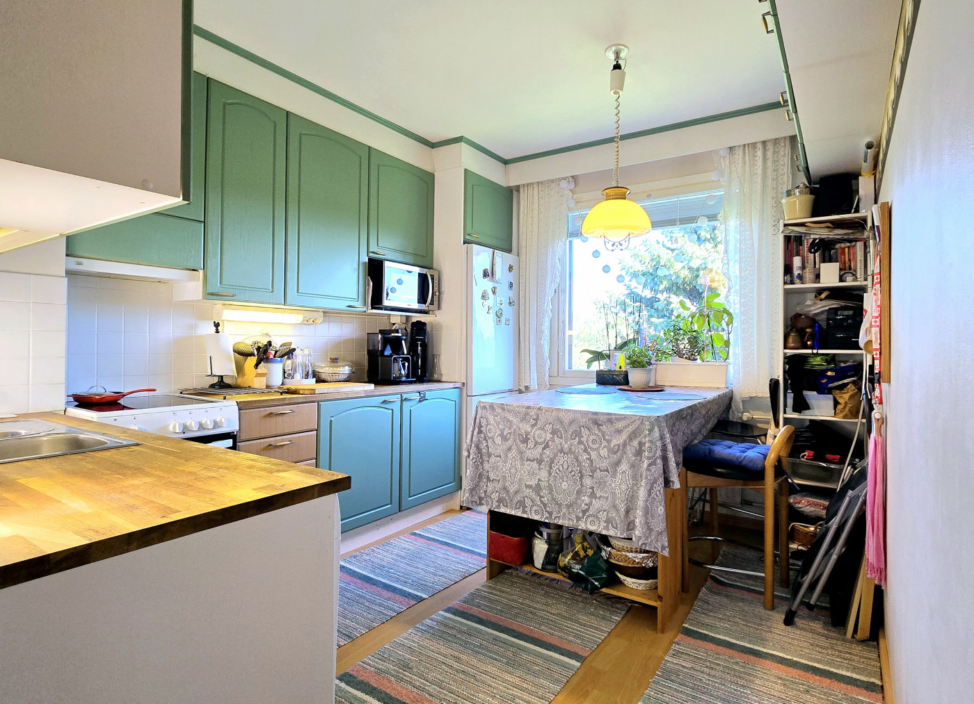 | Keittiö | Kauniiksi remontoidussa keittiössä jää/pakastinkaappiyhdistelmä, keraaminen sähköliesi, liesituuletin, astianpesukone ja vihertävät peiliovikeittiökaapistot mainioin lisäyläpikkukaapistoin. Keittiöön on lisäksi teetätetty kiinteä lisähyllyllinen petsattu komean umpimäntypuu -keittiönpöytä. Huoneiston lattioissa vaaleat laminaatit ja vaaleat tapetit vaalein runsain kuviotehostetapetein. |