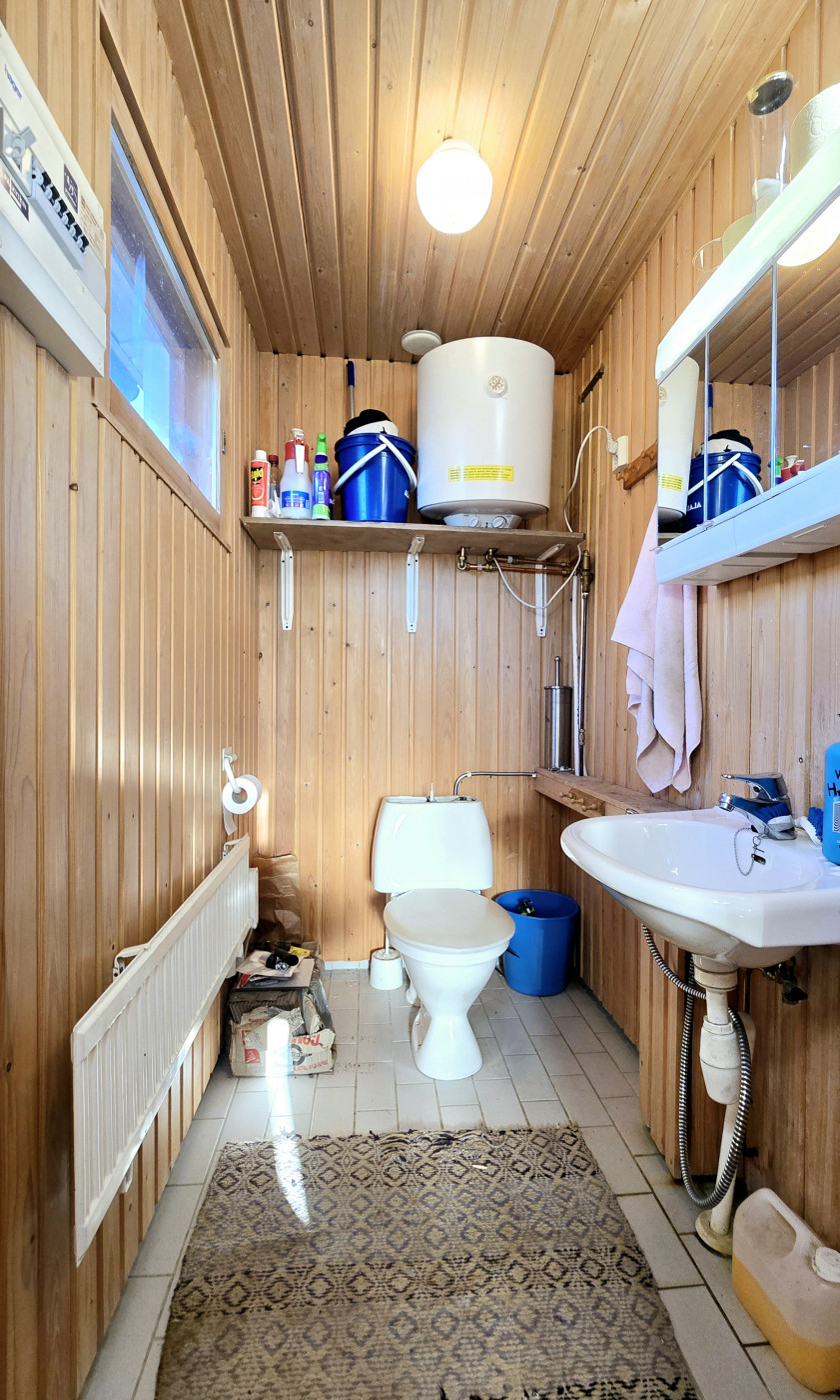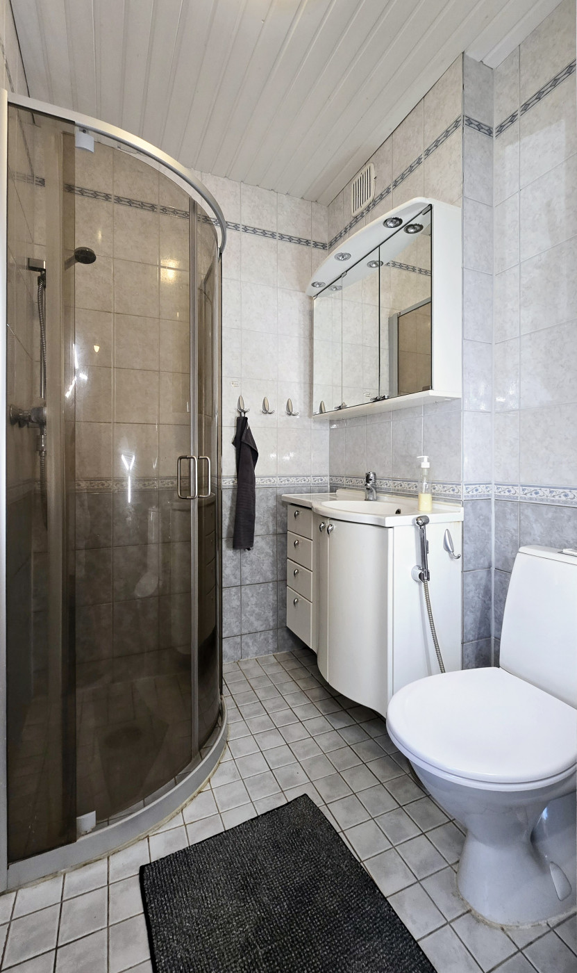 | Kylpyhuone | Tämän maalaismiljöö talon keskikerroksen asuintiloissa laatoitetut mainiot kylpyhuone- ja wc-tilat, jossa suihkukaappi, allas ylä- ja alakaapistoin, wc-istuin ja lattialämmitys. |