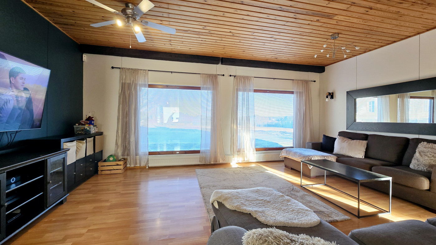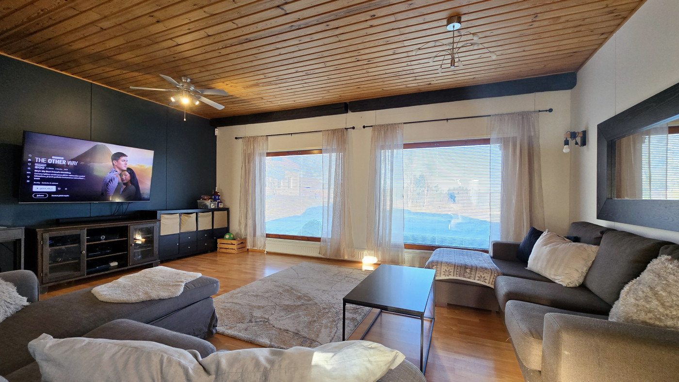 | Olohuone | Olohuoneeseen on laitettu komeat tummat kattoparrut. |