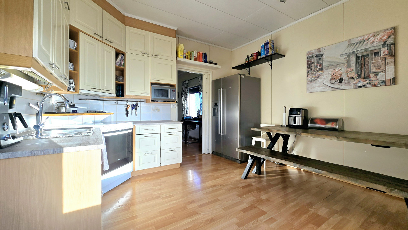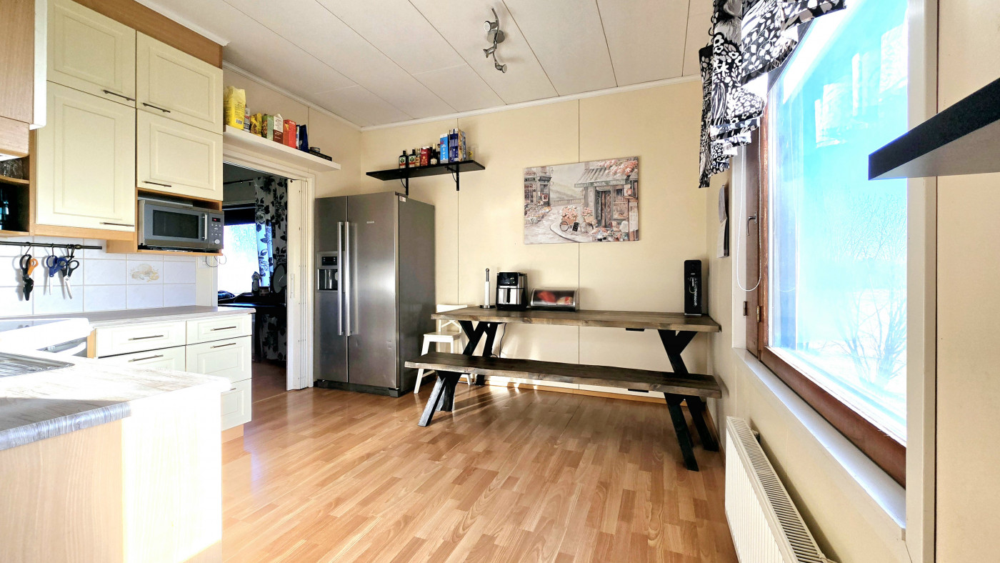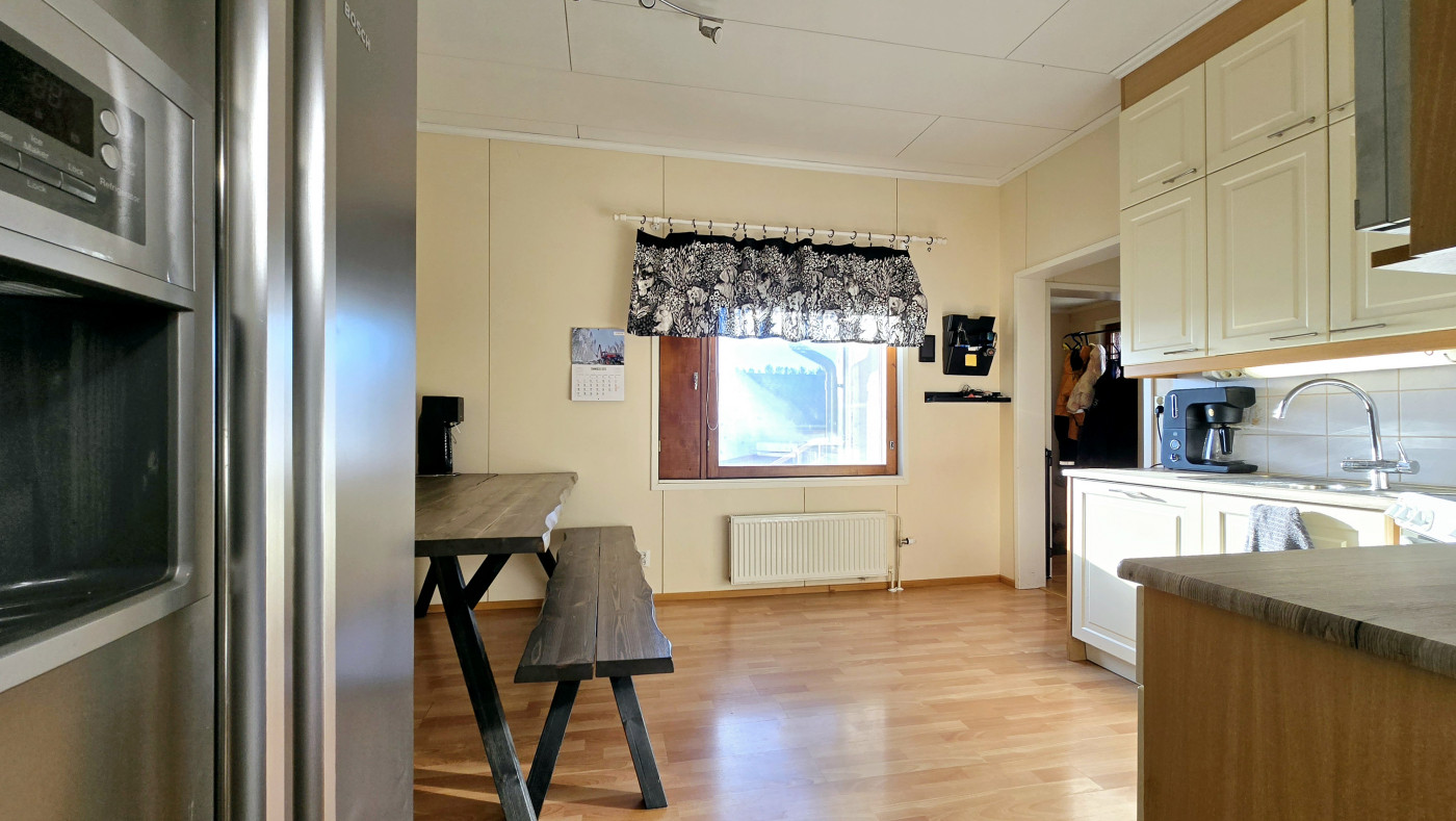 | Keittiö | Viihtyisässä keittiössä jää/pakastinkaappi, keraaminen sähköliesi, liesituuletin, integroitu astianpesukone ja 2000-luvulla runkoineen uusitut valkoiset peiliovikeittiökaapistot. Huoneistossa laminaattilattiat, maalatut sisäseinäpinnat ja sisäkatoissa myös näyttävää puupintaa. |